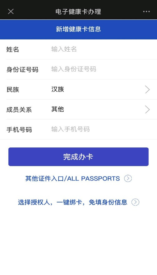 2、帮家人填入新增健康卡信息,点击“完成办卡”。