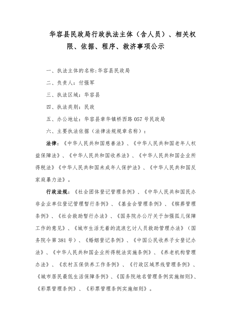 华容县民政局行政执法主体(含人员)、相关权限、依据、程序、救济事项公示