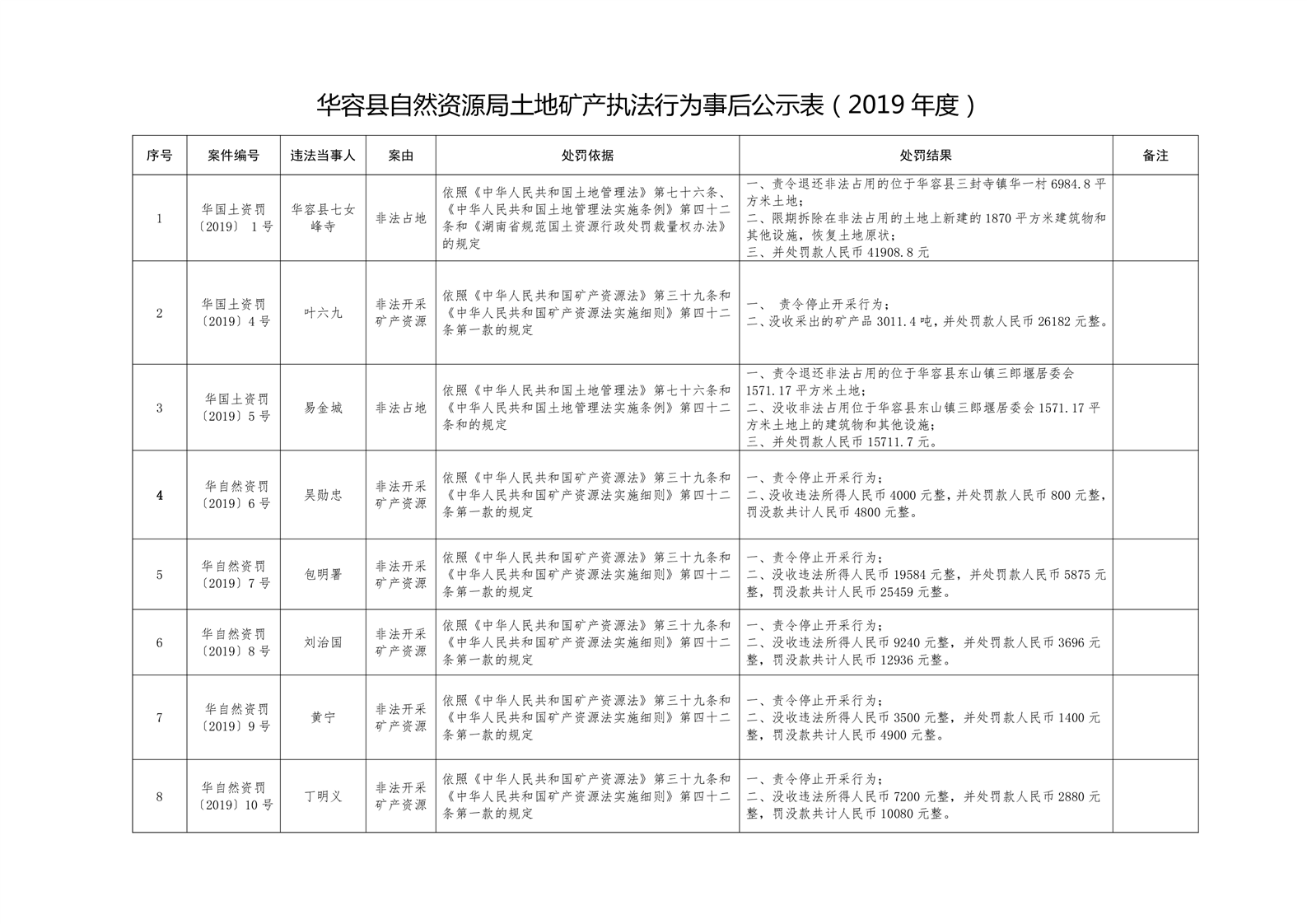 华容县自然资源局土地矿产执法行为事后公示表(2019年度)