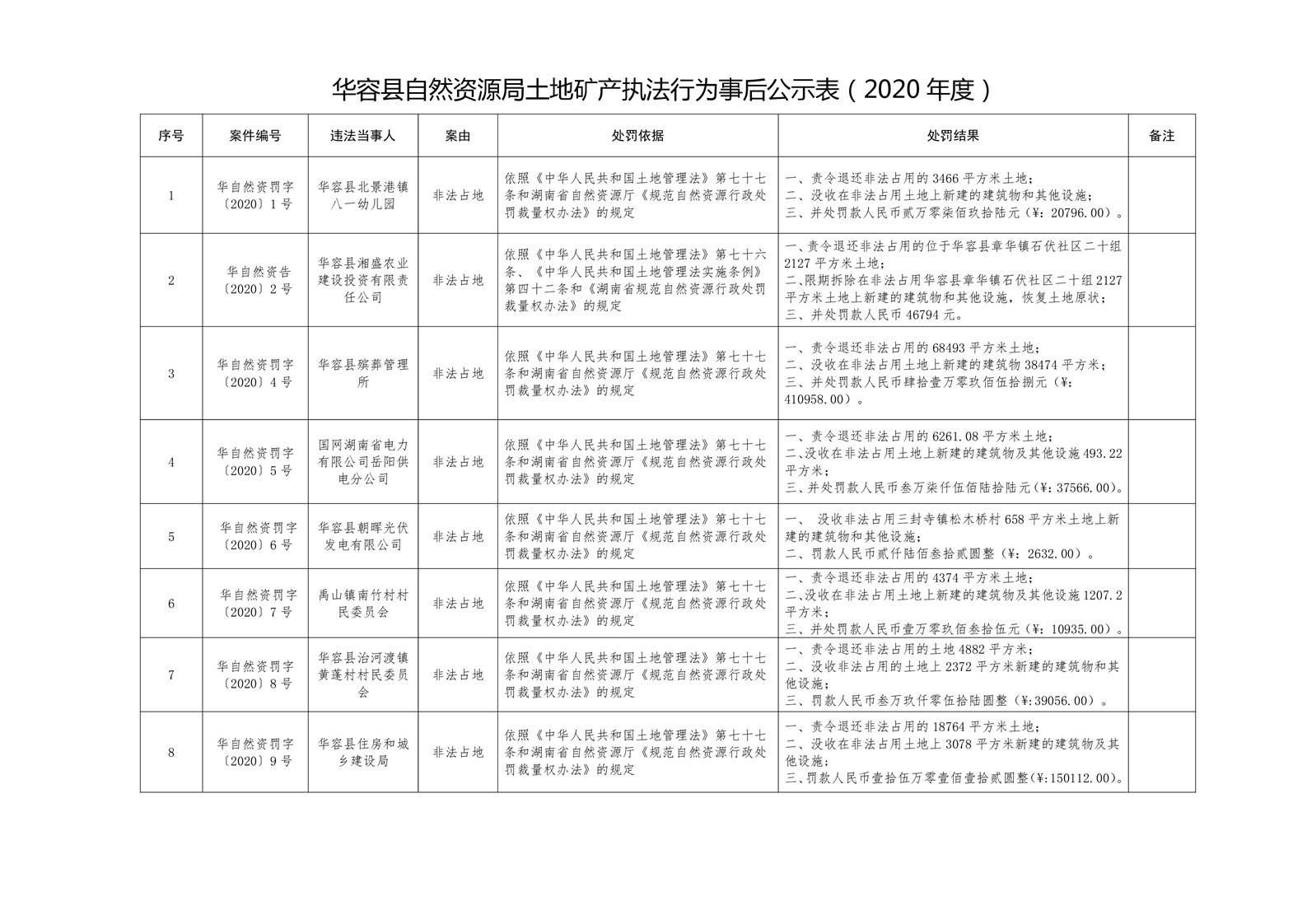 华容县自然资源局土地矿产执法行为事后公示表(2020年度)