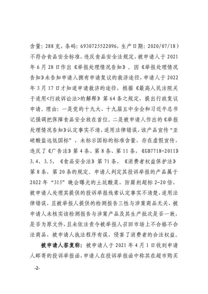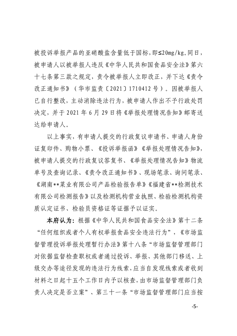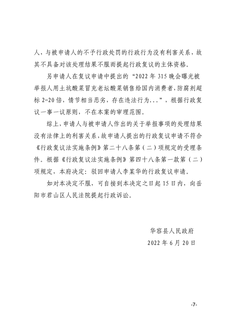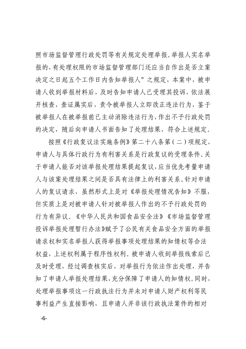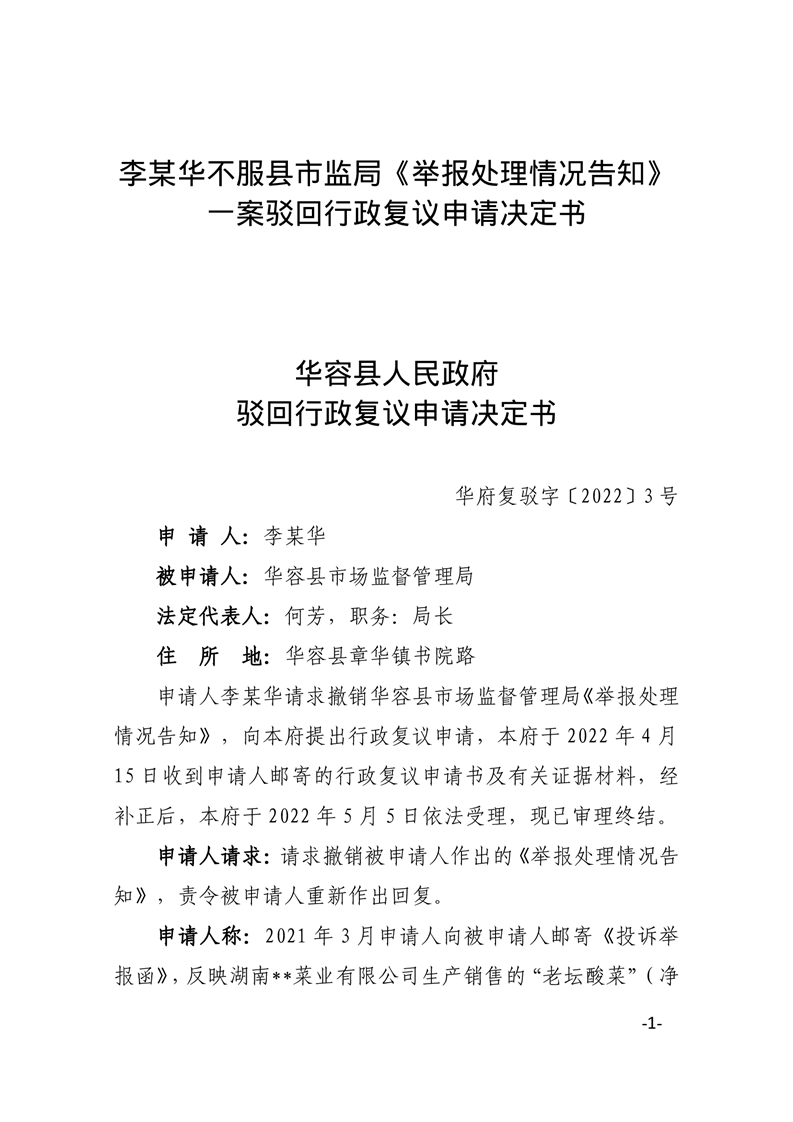 李某华不服县市监局《举报处理情况告知》一案驳回行政复议申请决定书