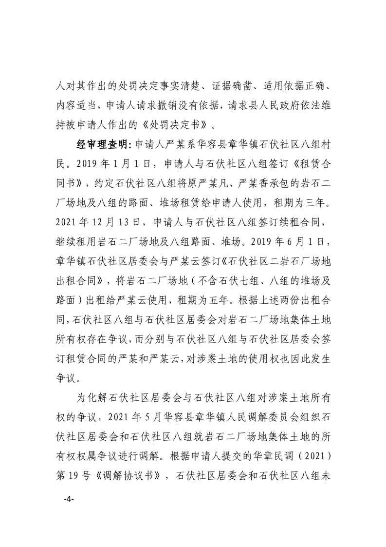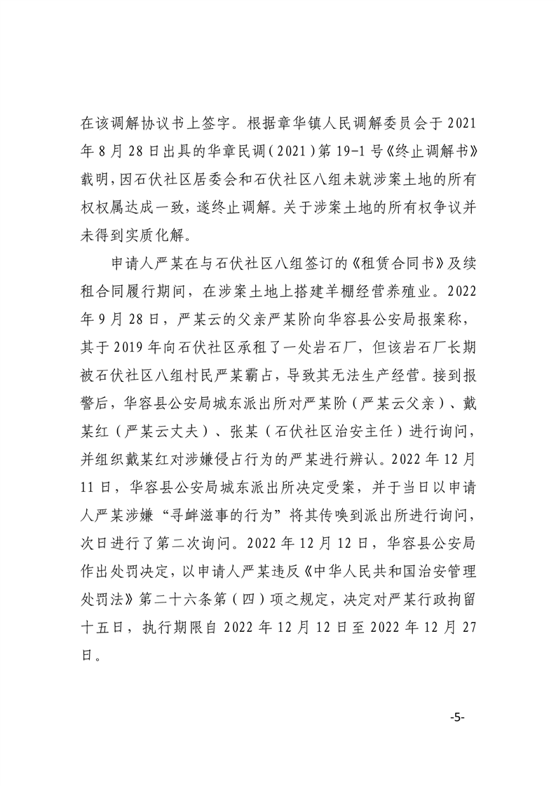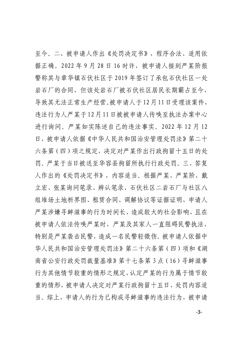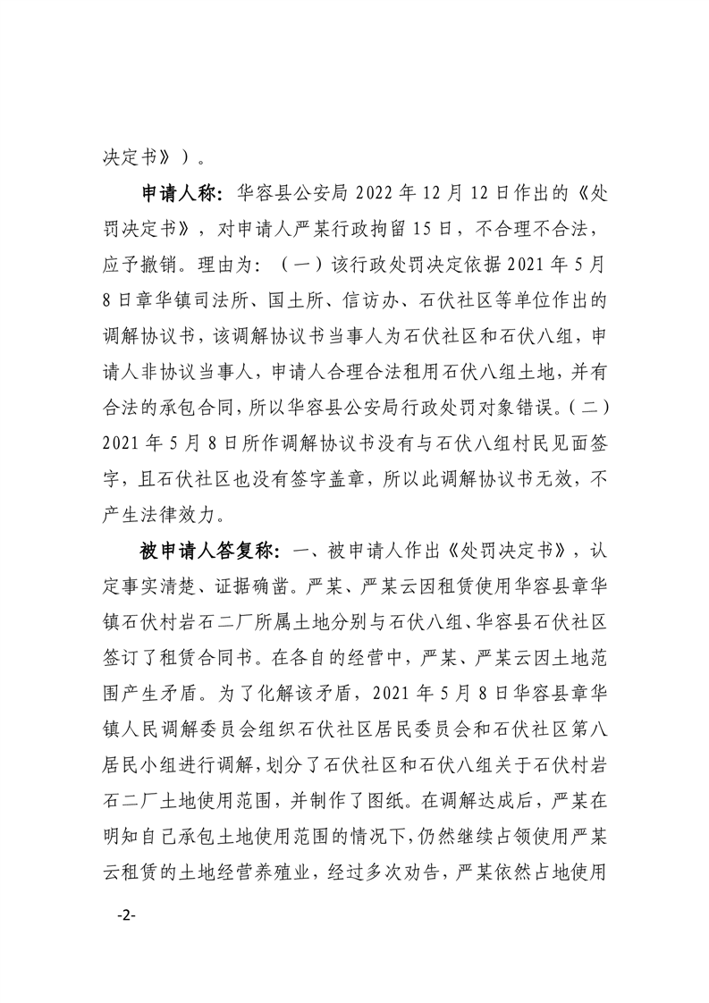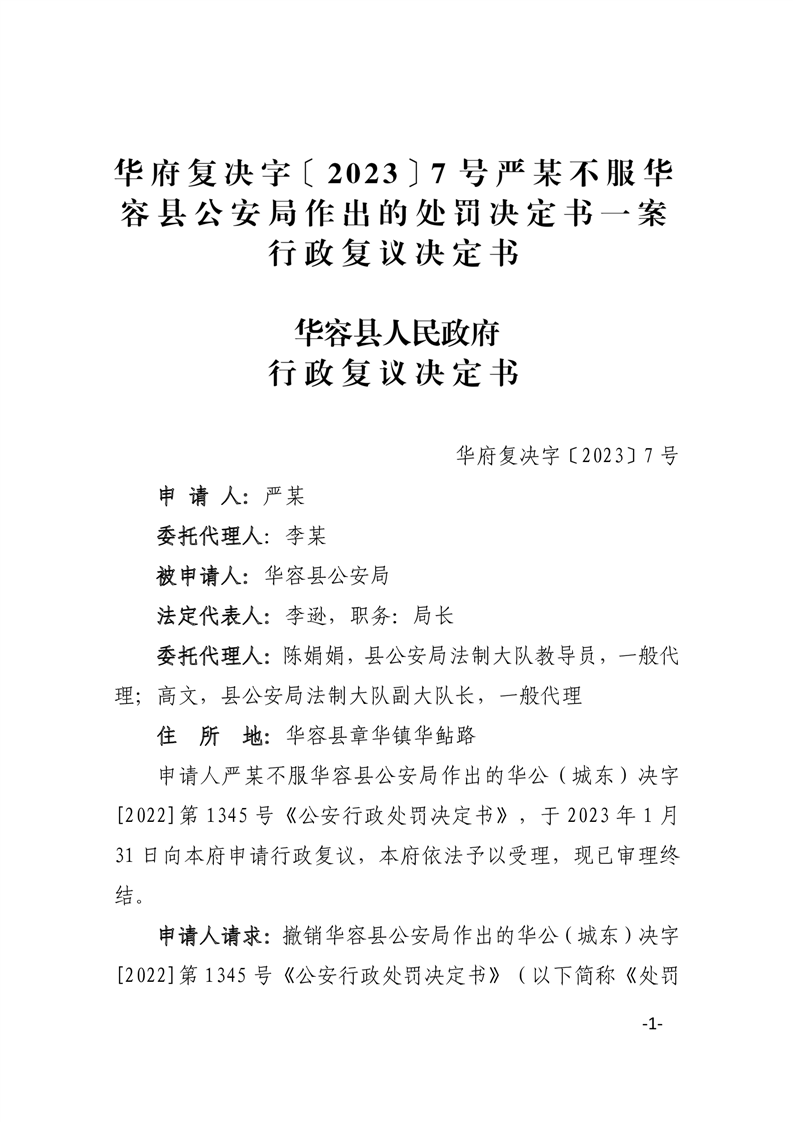 华府复决字〔2023〕7号严某不服华容县公安局作出的处罚决定书一案行政复议决定书