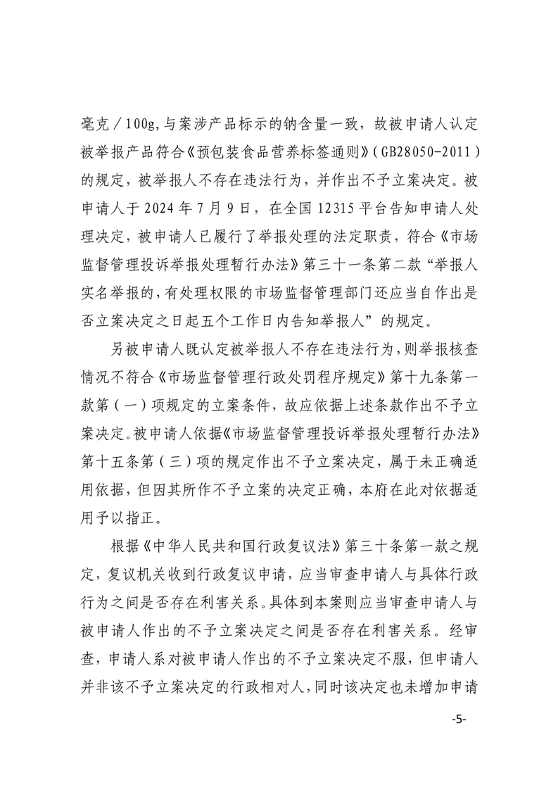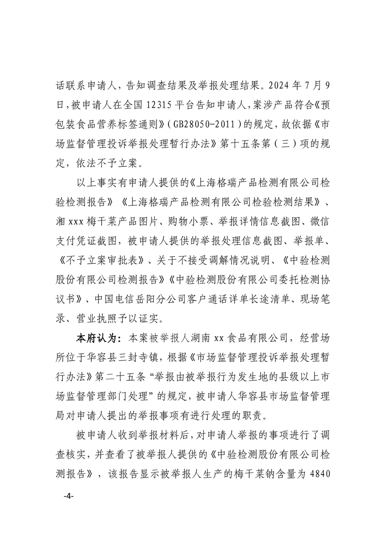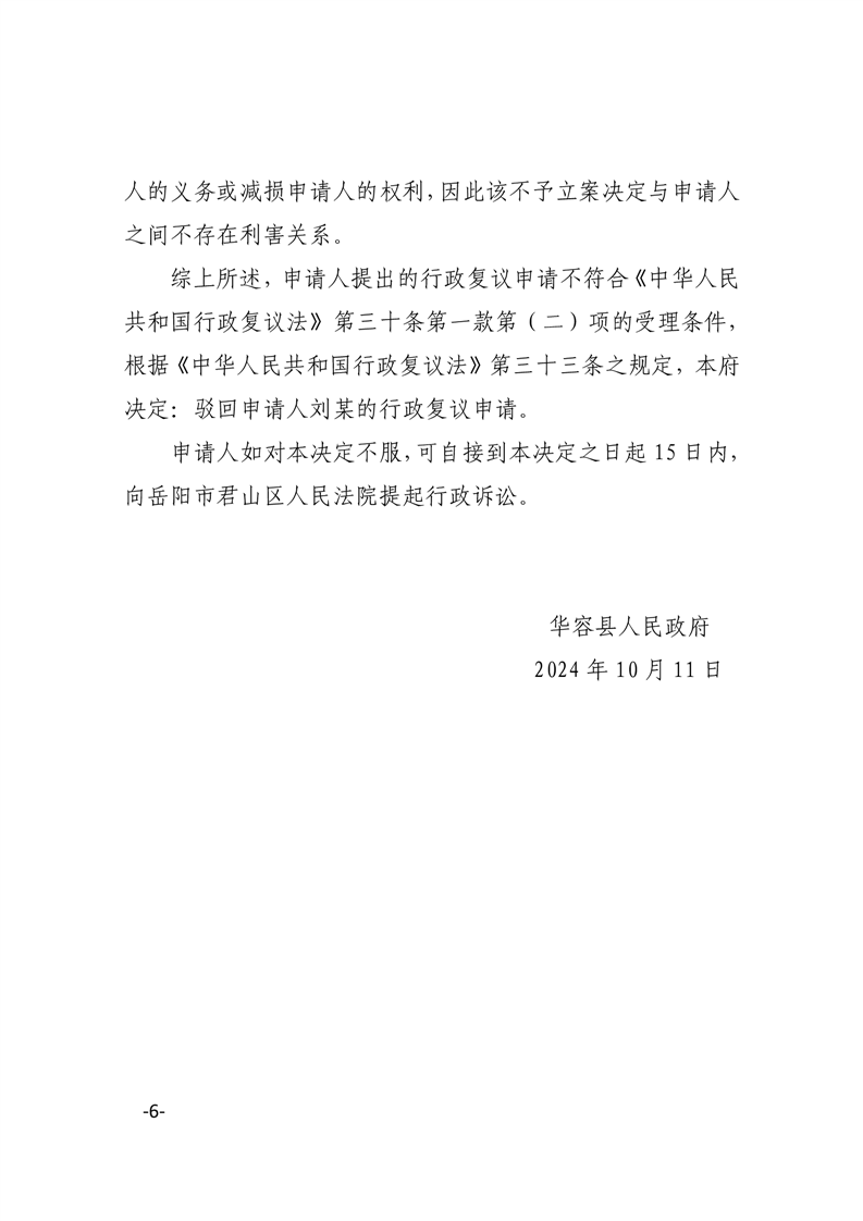 华府复决字〔2024〕27号刘某不服华容县市场监督管理局在全国12315平台作出的不予立案决定一案驳回行政复议申请决定书