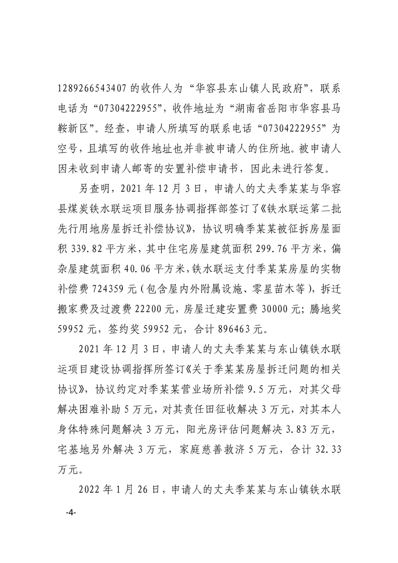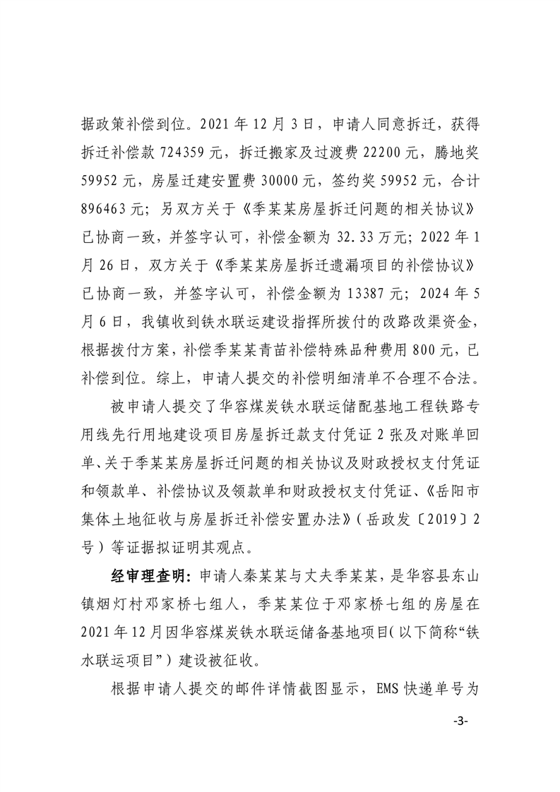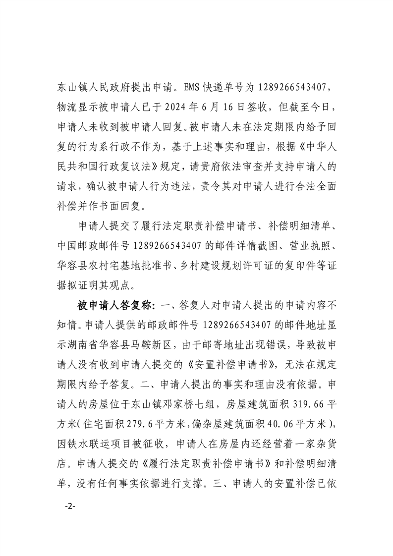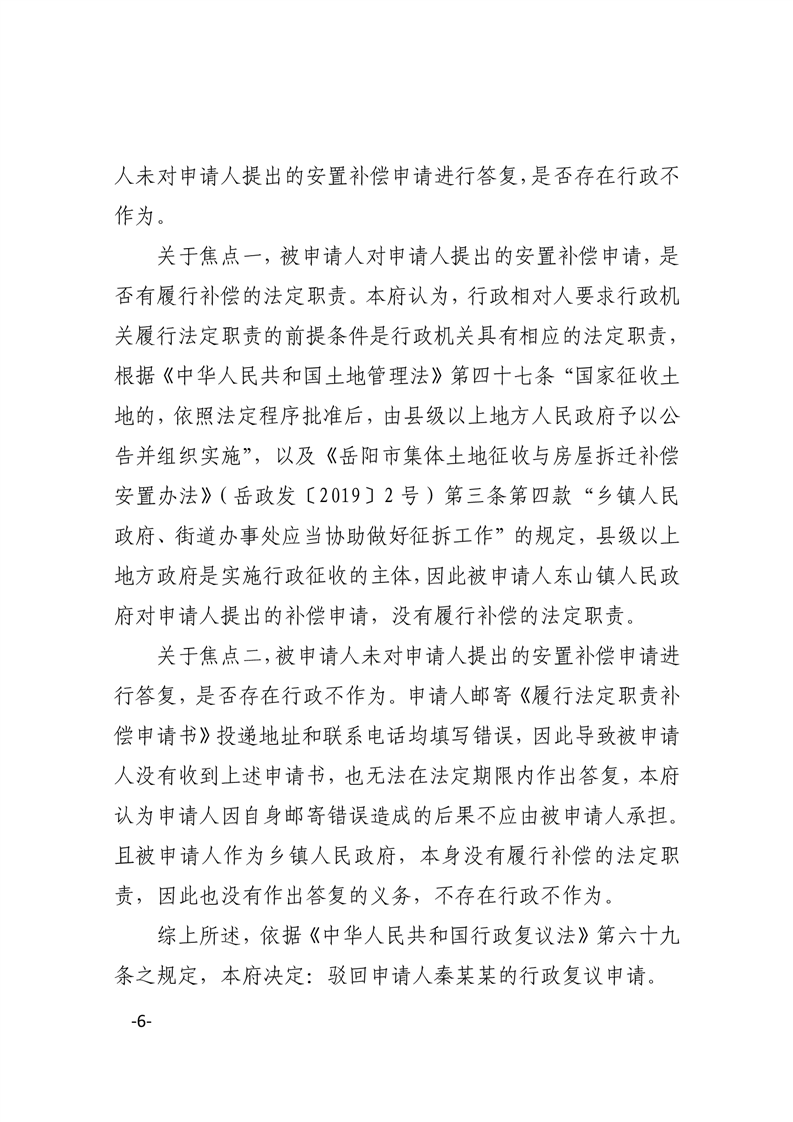 华府复决字〔2024〕37号 申请人秦某某对被申请人东山镇人民政府在法定期限内未对其提出的《安置补偿申请》进行答复不服一案行政复议决定书