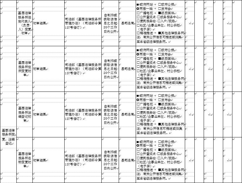 ■ 政府网站 □政府公报 □两微一端 □发布会 □广播电视 □纸质媒体 £公开查阅点 ■政务服务中心 £便民服务站 □入户/现场 □社区/企事业单位、村公示栏 (电子屏) □精准推送 ■其他法律服务网注:有关公开信息可推送或归集至本省级法律服务网。 |