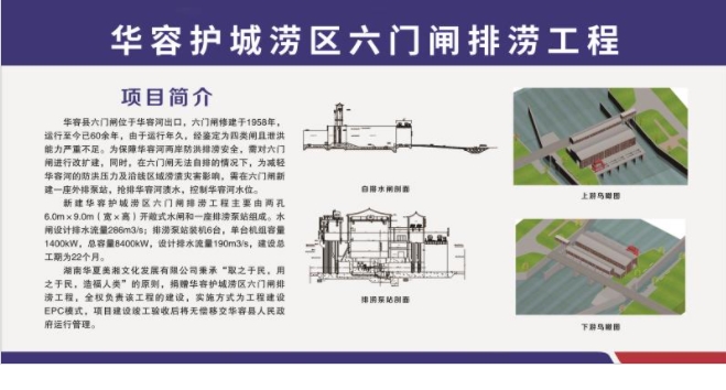 六门闸排涝工程总投资约3.16亿元,由中国华夏文化遗产基金会投资捐建,通过改扩建现有六门闸及新建六门闸泵站,控制华容河水位,可提高华容河沿线防洪排涝能力,有利于消除原六门闸超负荷运行的安全隐患,大幅提高防洪保安能力、排涝除渍能力和农田灌溉能力,具有十分明显的安全效益、经济效益、社会效益等综合性效益。