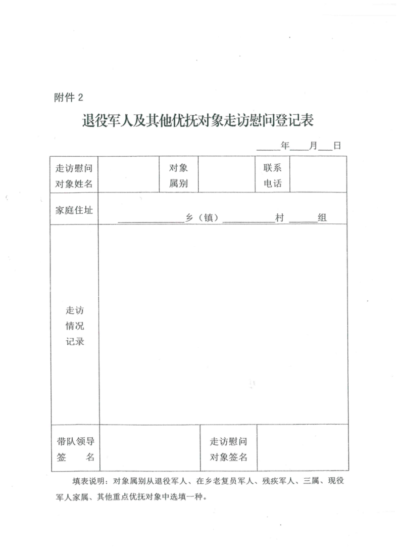 3.结合相关工作。要将此次走访慰问工作要与现役军人立功喜报送达,退役军人回乡欢迎仪式等结合起来。各村(居)为单位,通过举行简朴热烈、喜庆隆重的仪式,统筹安排。