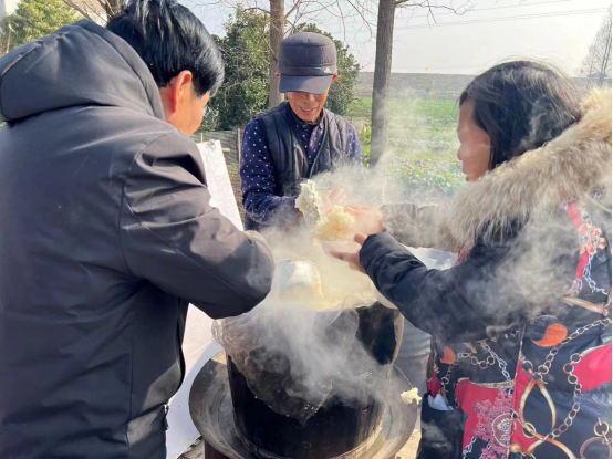 周围居民纷纷在旁边其加油呐喊,一片欢声笑语,刚打好的糍粑热气腾腾,散发的糯米香吸引了许多老人家争相品尝,大家吃着香甜的糍粑,互相分享,个个笑得像花儿一样。