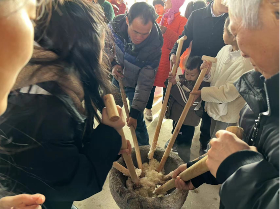 打糍粑通常都需要邀请亲人或邻里一起来完成,团结互助,随着热气腾腾的糯米一出锅,当地群众纷纷加入手打糍粑队伍,居民们手持木槌,把热腾腾的糯米倒进石臼里进行捶打,大家挥起木槌,用力捶打,锤起锤落,不过十来分钟的功夫,糯米就粘成一片,气氛十分热烈。