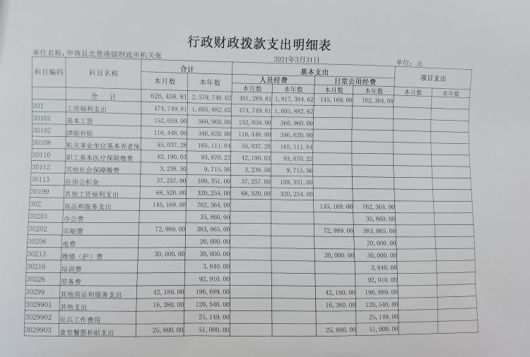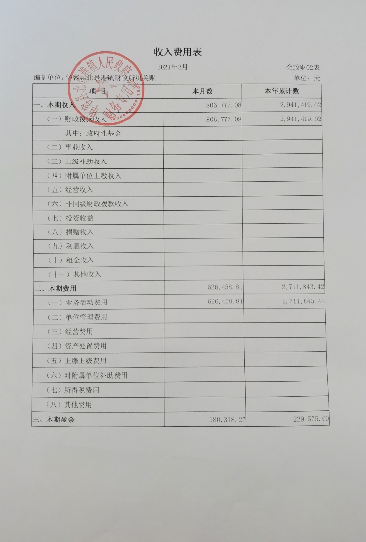 华容县北景港镇2021年一季度会计报表