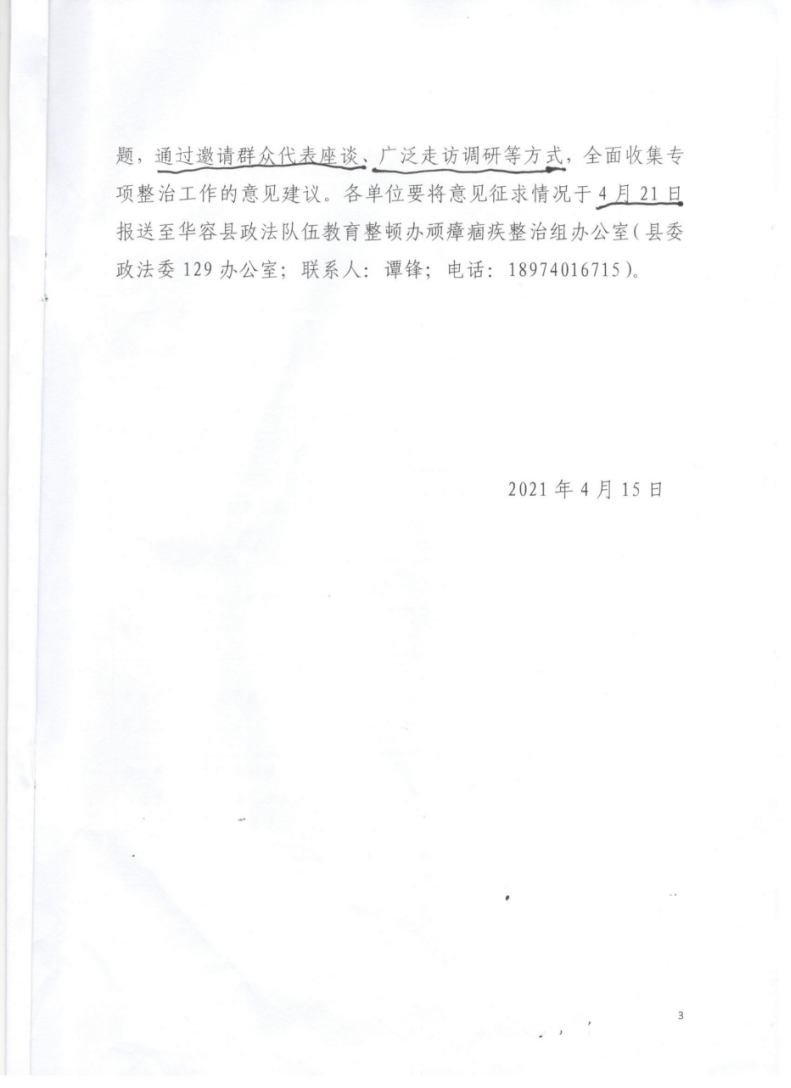 现将《关于对华容县政法系统顽瘴痼疾整治工作征求意见的通知》转发给你们,请认真按照文件精神落实,并将意见征集情况于4月20日前报送至镇综治办涂姿。