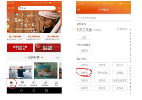 2.进入 APP 后,点击左下角的“首页”,并定位到湖南省