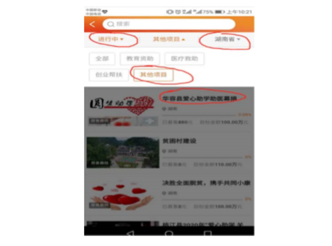 3.按项目领域(其他领域)和区域(湖南省)进行选择,即可看到华容县众筹项目