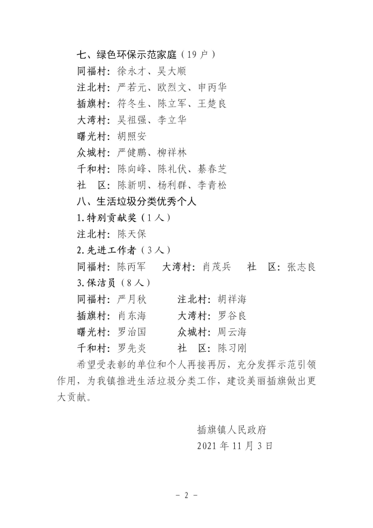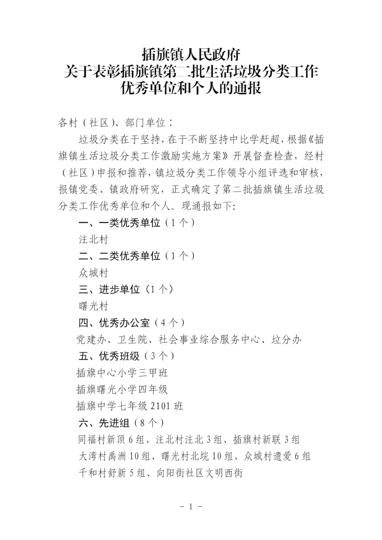关于表彰插旗镇第二批生活垃圾分类工作优秀单位和个人的通报