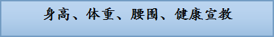 1、常规体格体检:体温、脉搏、呼吸、血压、体重、腰围、臀围、皮肤、浅表淋巴洁、心脏、肺部、腹部等常规体检,并对口腔、视力、听力和运动功能等进行判断。