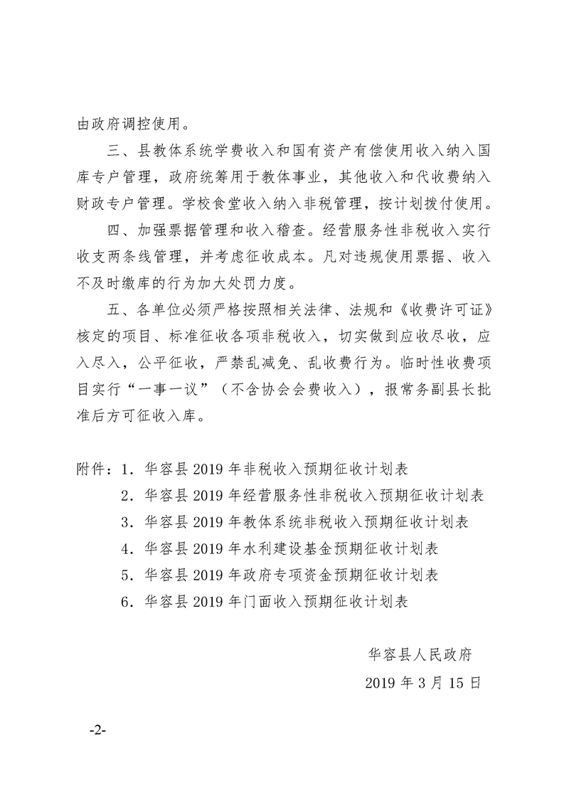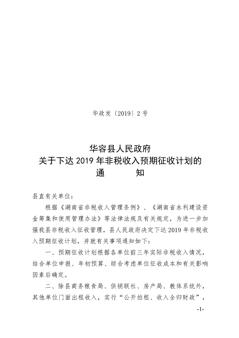 华容县人民政府关于下达2019年非税收入预期征收计划的通知
