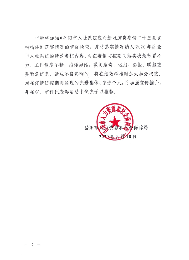 关于印发《岳阳市人社系统应对新冠肺炎疫情二十三条措施》的通知