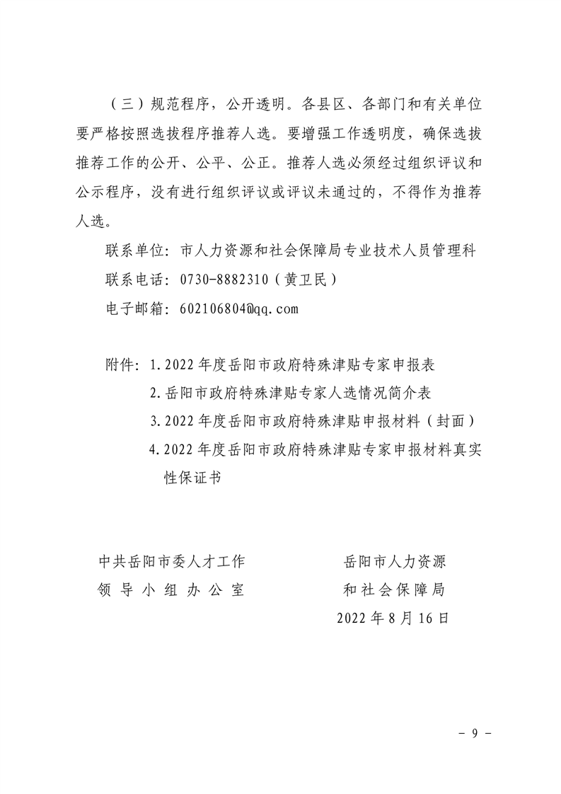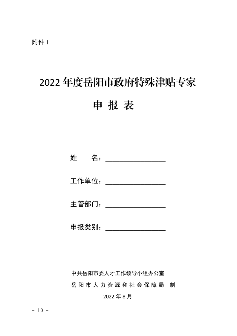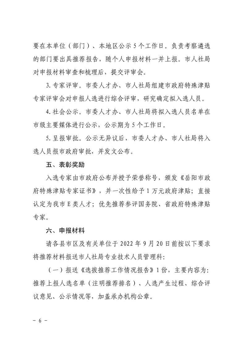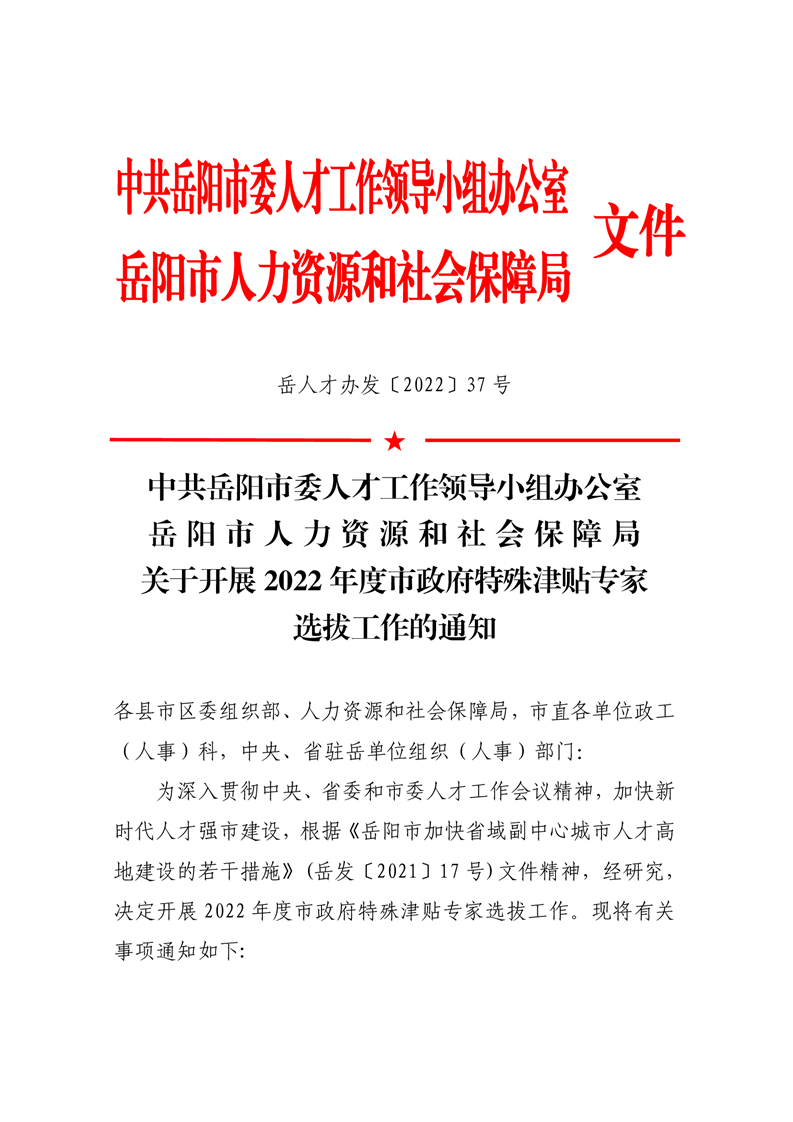 关于转发《中共岳阳市委人才工作领导小组办公室 岳阳市人力资源和社会保障局关于开展2022年享受市政府特殊津贴专家选拔工作的通知》的通知
