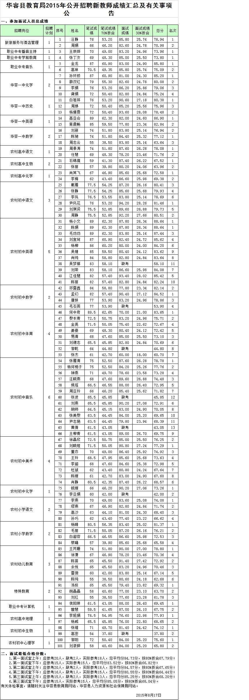 华容县教育系统2015年公开招聘新教师成绩汇总表