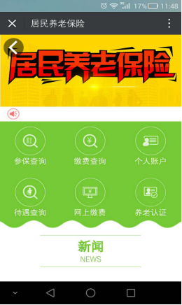 第四步:进入【居民养老保险】后即可看到查询、缴费等功能(如下图所示),点击相应功能并完成用户注册后即可使用。