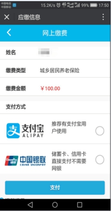 第二步:选择缴费档次、点击缴费后,需要选择缴费方式,目前支付宝和银联两种支付方式都可以。参保人可根据自己的喜好进行选择。