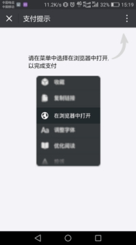 按提示在浏览器中打开,点击微信提示上按钮,用手机浏览器打开,浏览器会自动打开支付宝模块,用户进行支付宝登录,并输入支付宝的支付密码,完成整个支付交易。