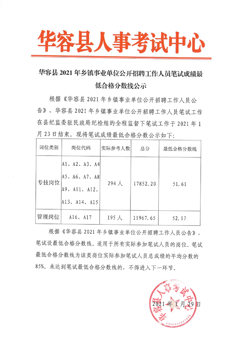 华容县2021年乡镇事业单位公开招聘工作人员笔试成绩最低合格分数线公示