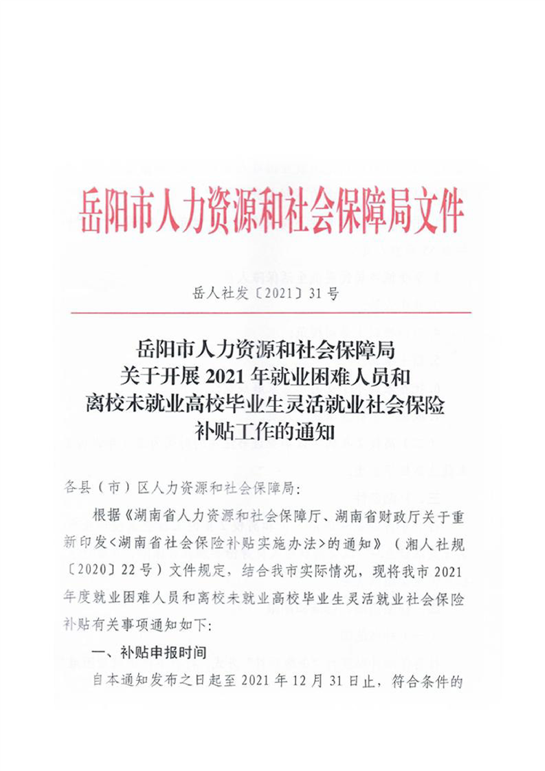 关于转发岳阳市人力资源和社会保障局《关于开展2021年就业困难人员和离校未就业高校毕业生灵活就业社会保险补贴工作的通知》的通知