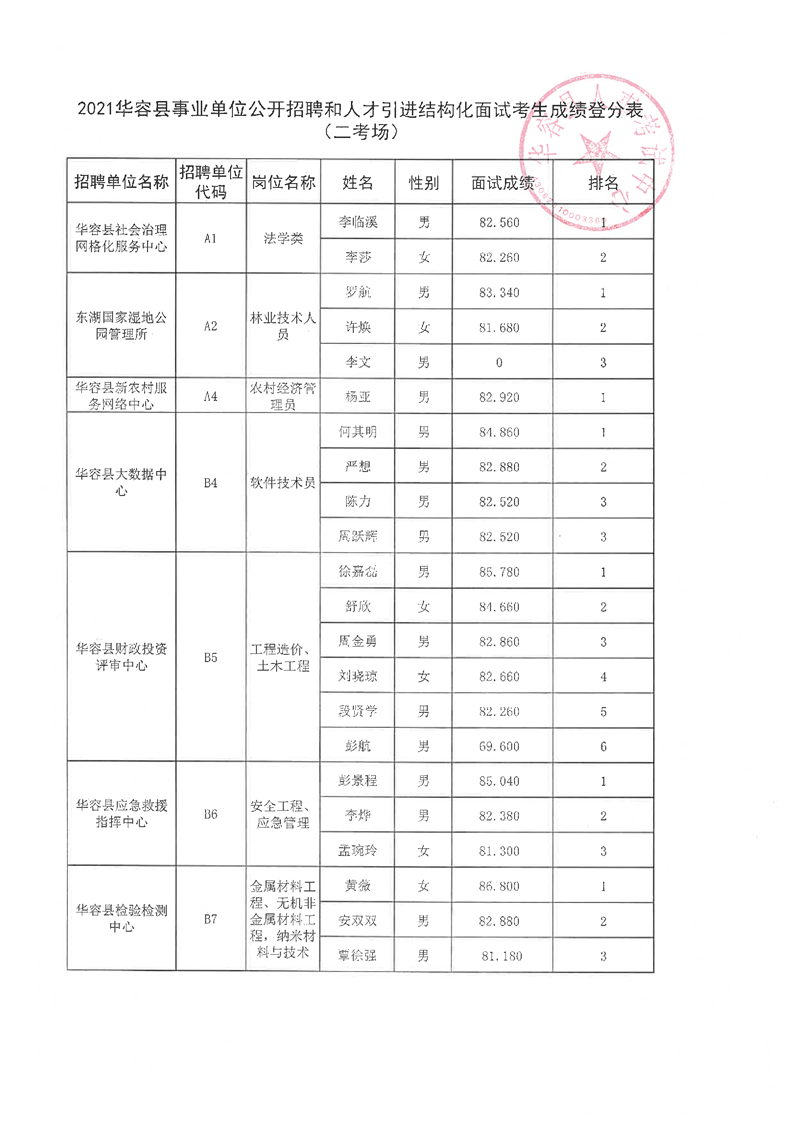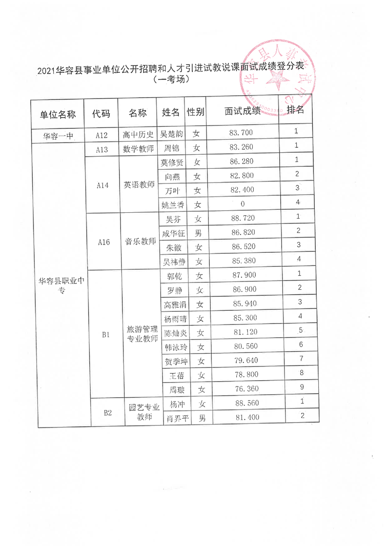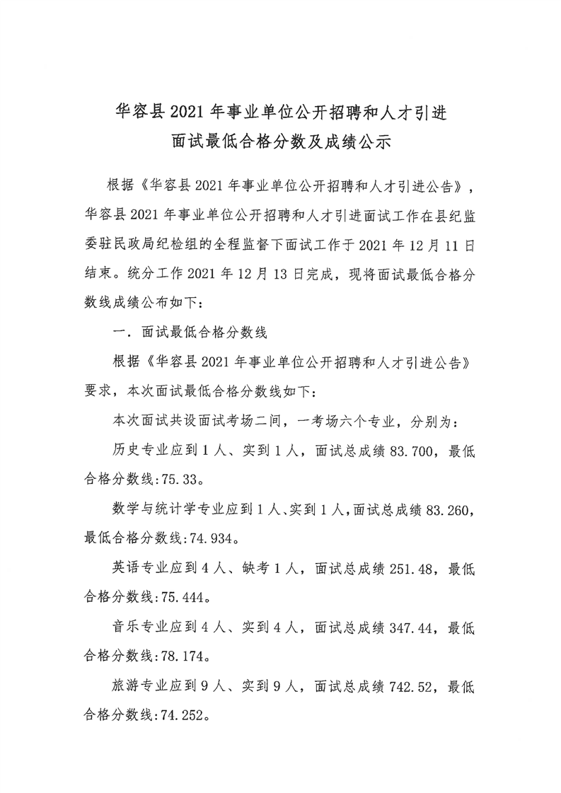 华容县2021年事业单位公开招聘和人才引进面试最低合格分数及成绩公示