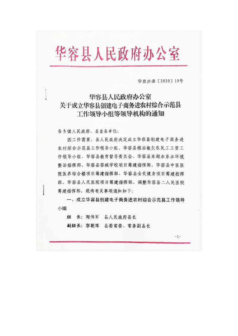 (华政办函〔2020〕19号)关于成立华容县创建电子商务进农村综合示范县工作领导小组等领导机构的通知