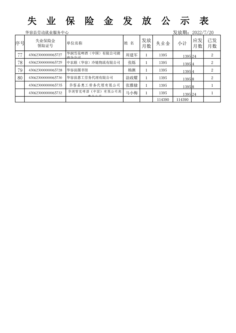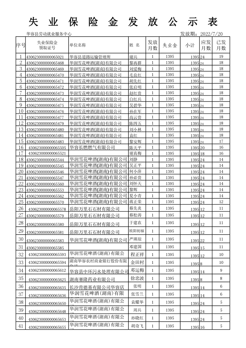 2022年7月失业保险保险金发放公示表