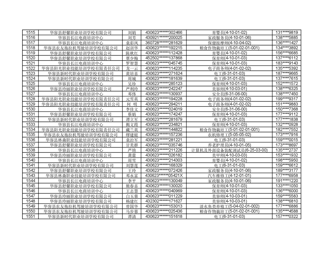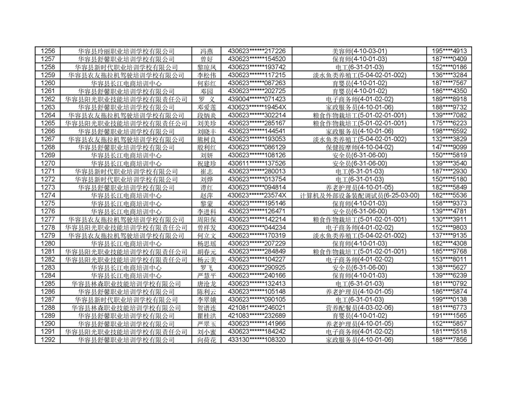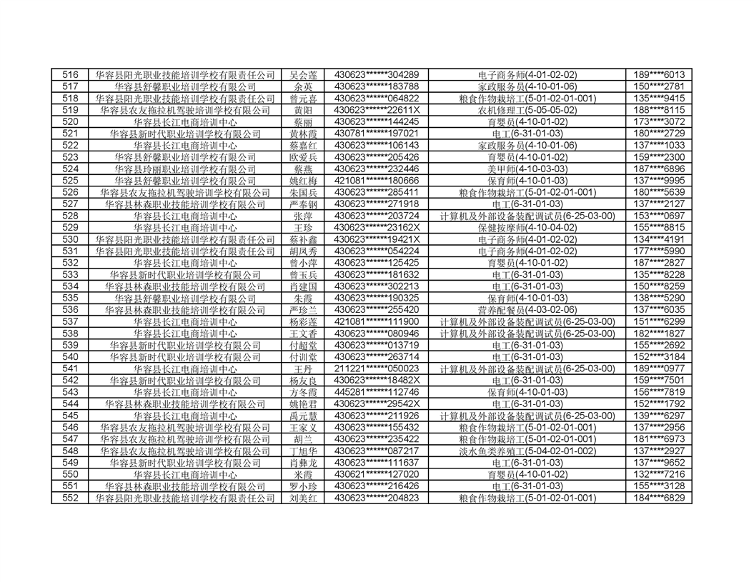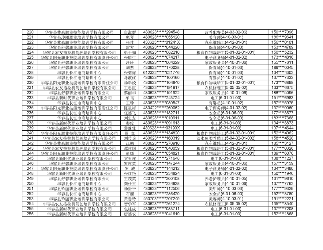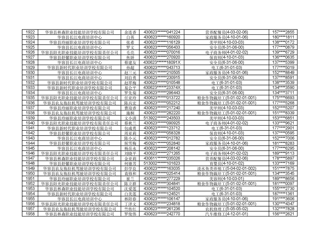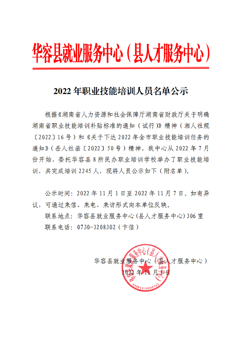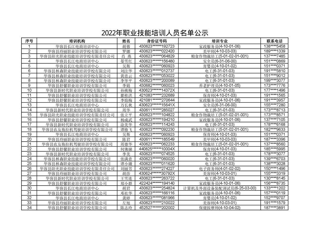 关于华容县2022年职业培训人员名单的公示