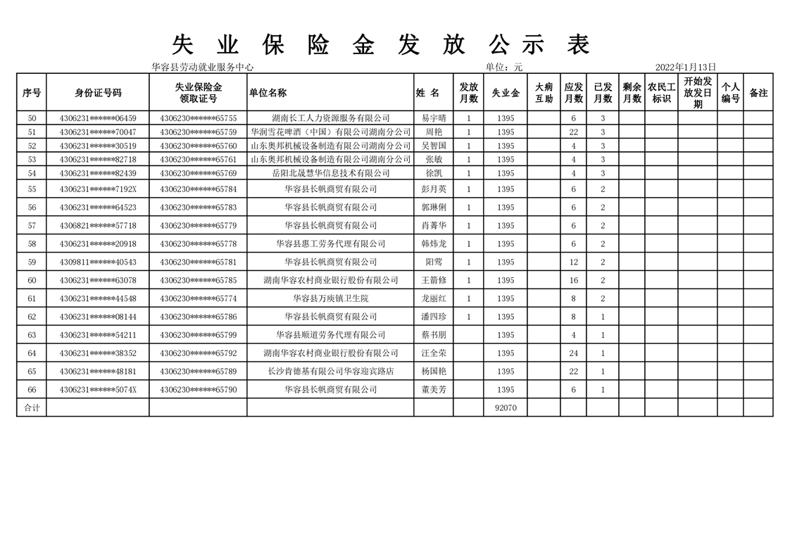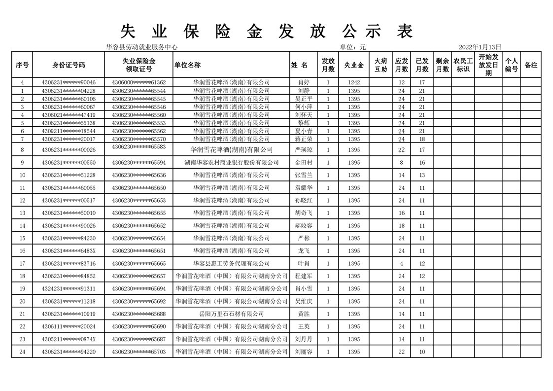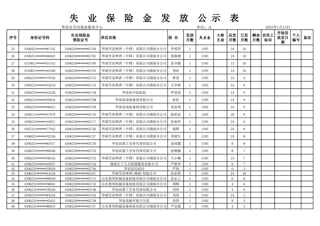 2023年1月份失业保险金公示表