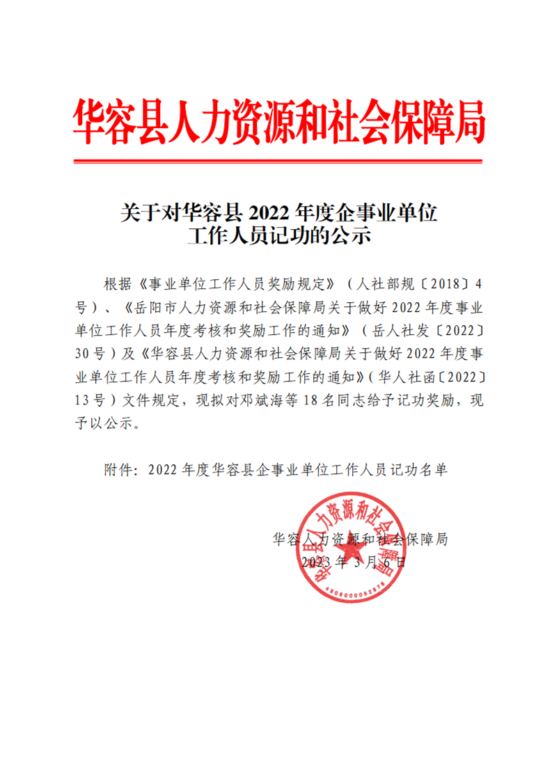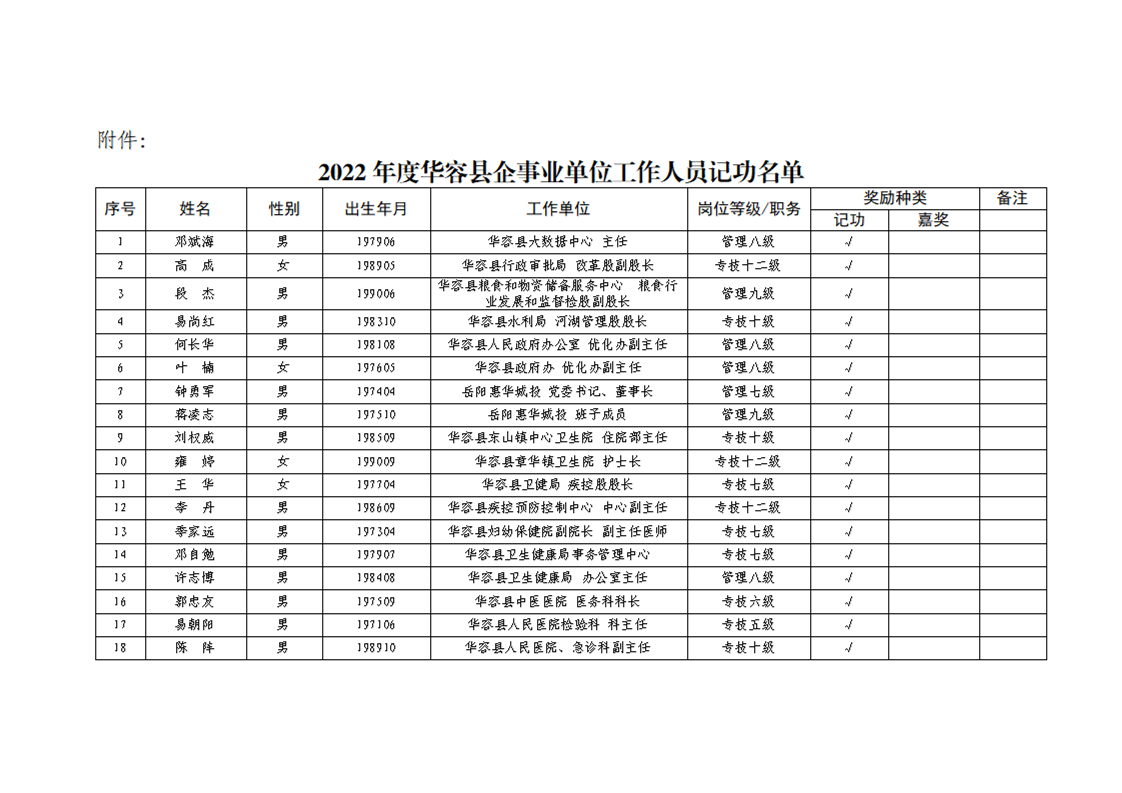 关于对华容县2022年度企事业单位工作人员记功的公示