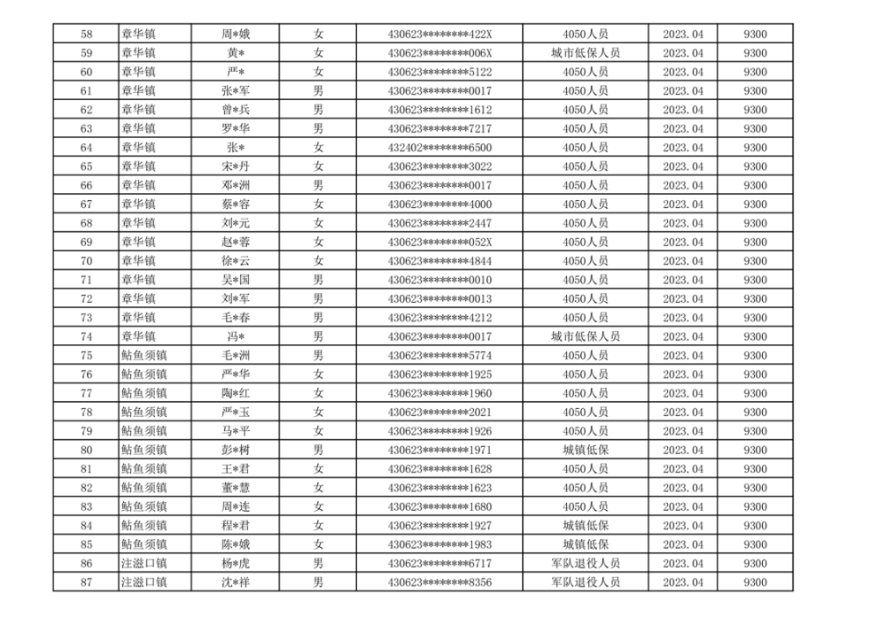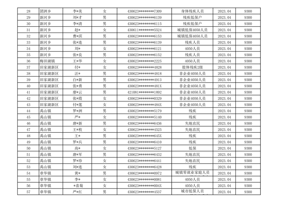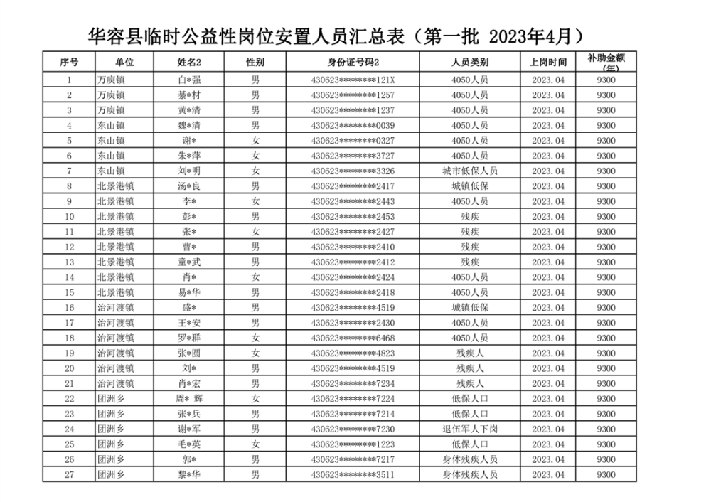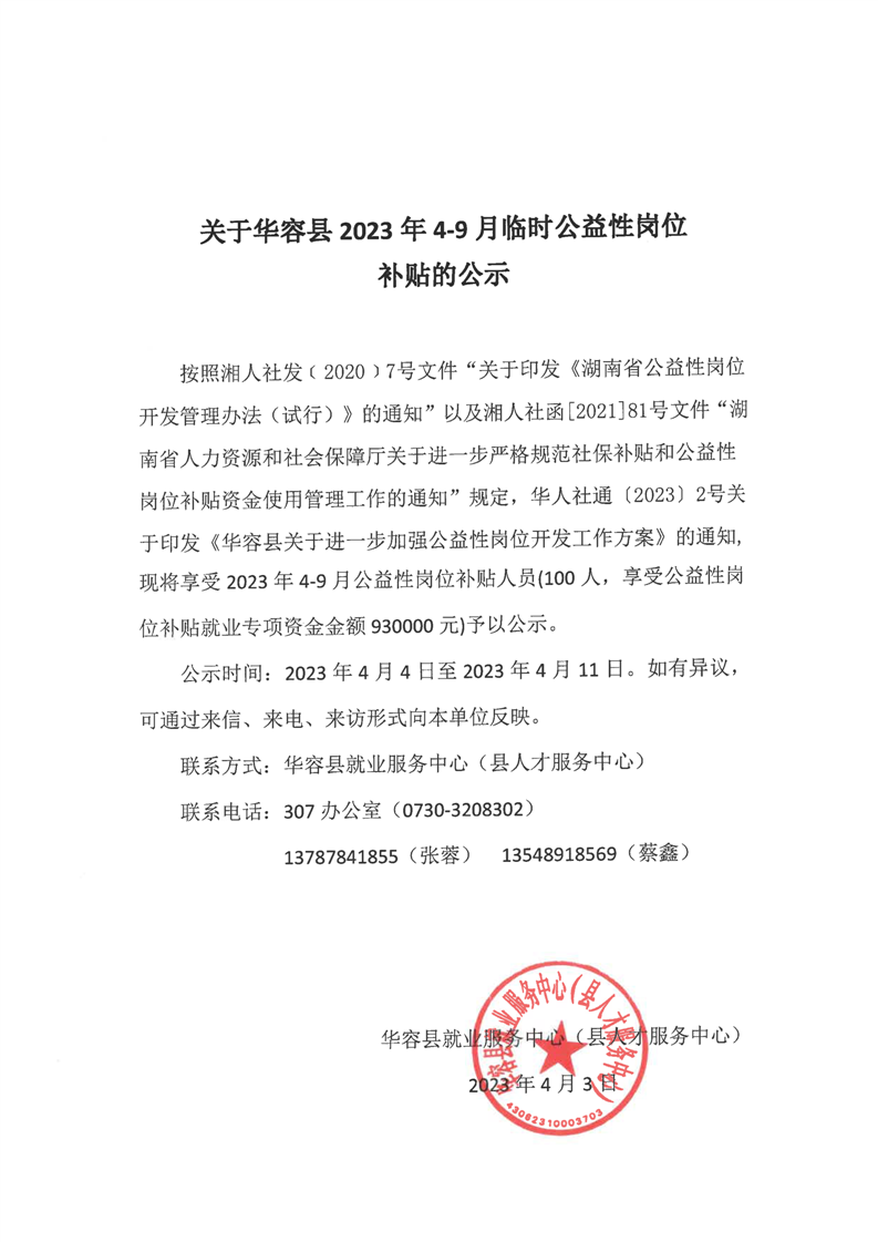 关于华容县2023年4-9月临时公益性岗位补贴的公示