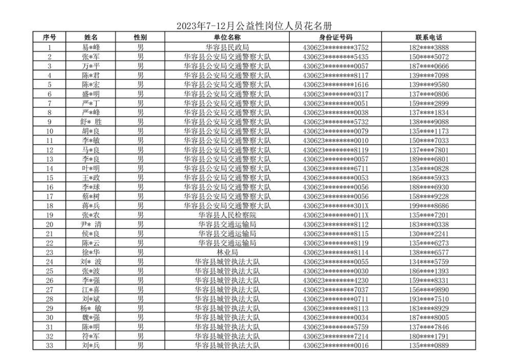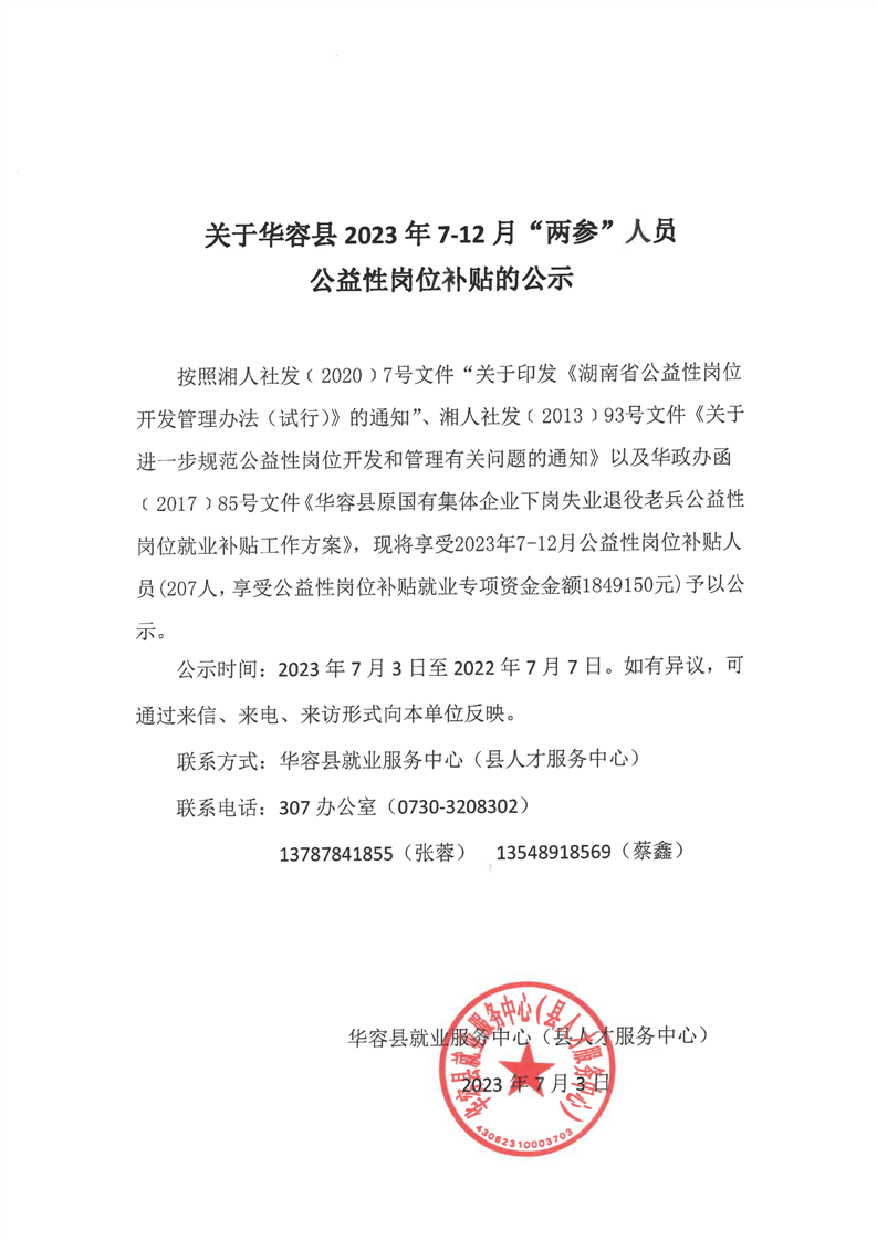 关于华容县2023年7-12月“两参”人员公益性岗位补贴的公示