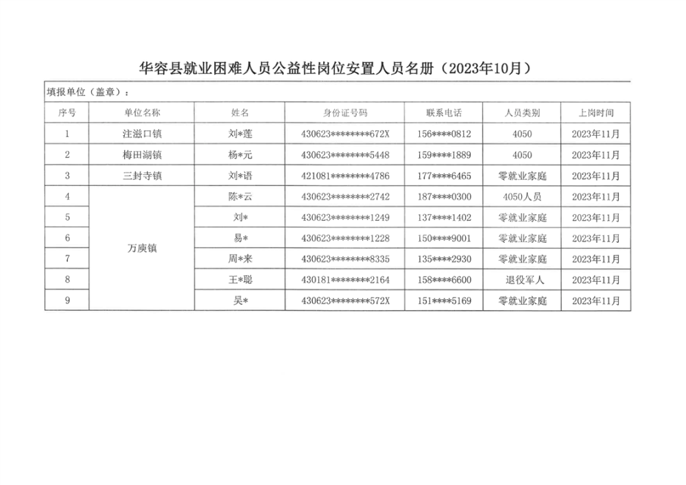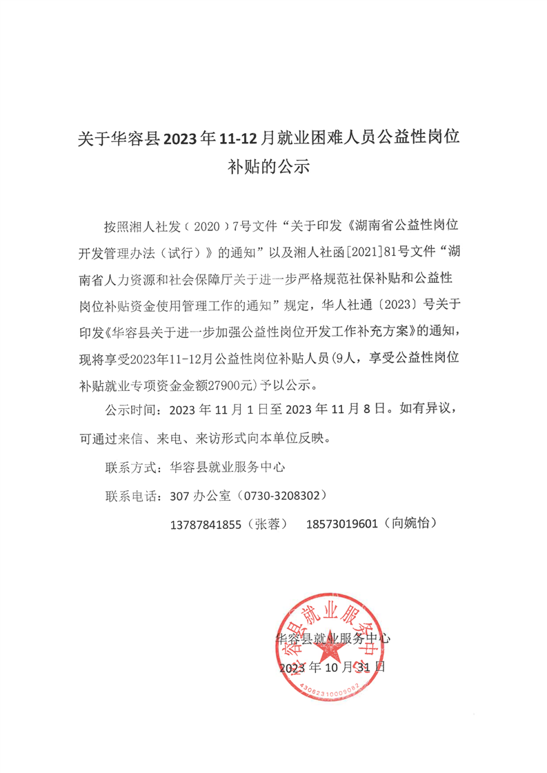 关于华容县2023年11-12月就业困难人员公益性岗位补贴的公示