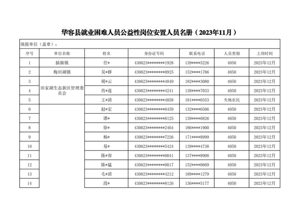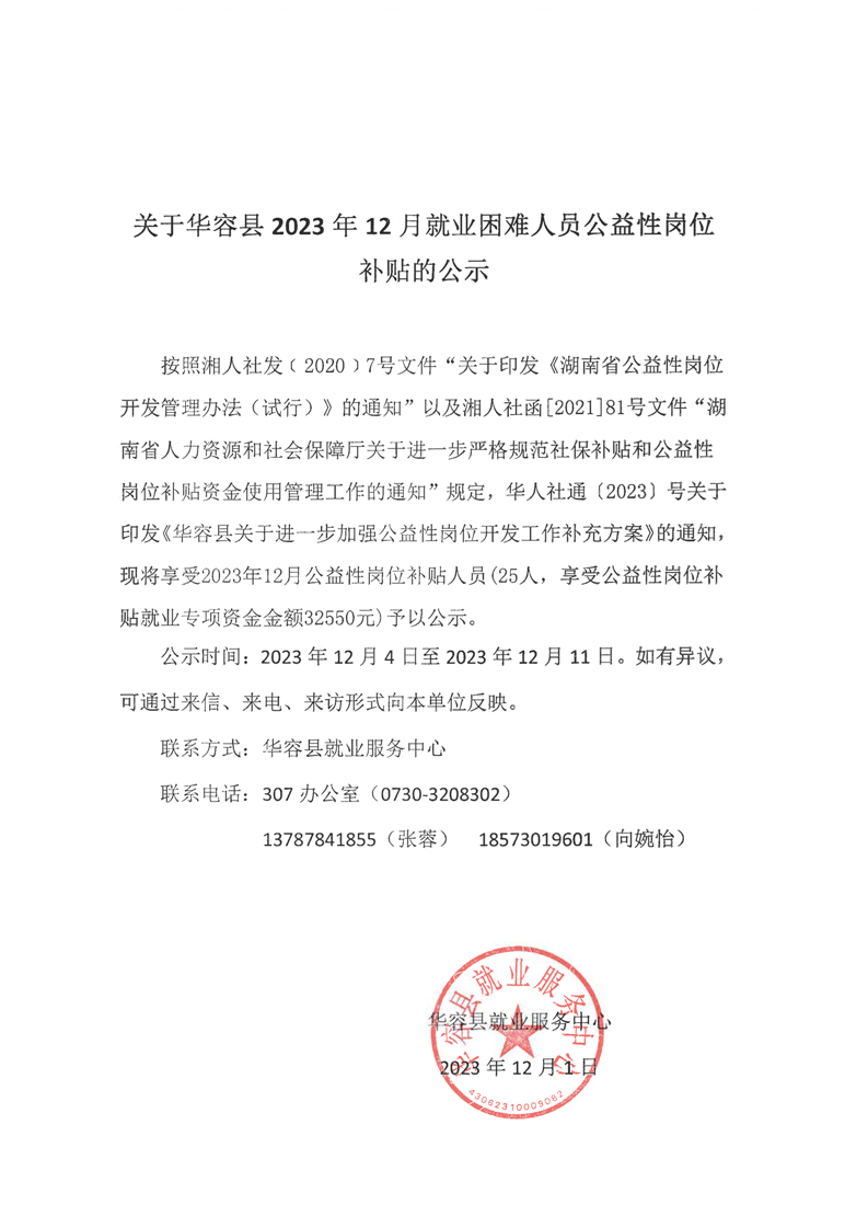 关于华容县2023年12月就业困难人员公益性岗位补贴的公示