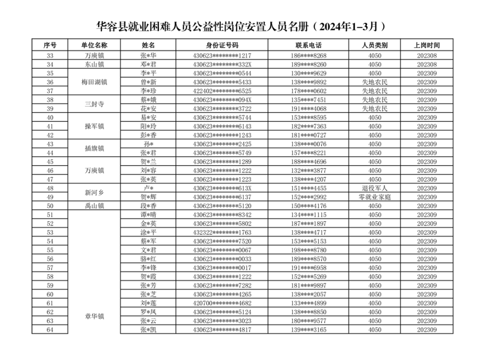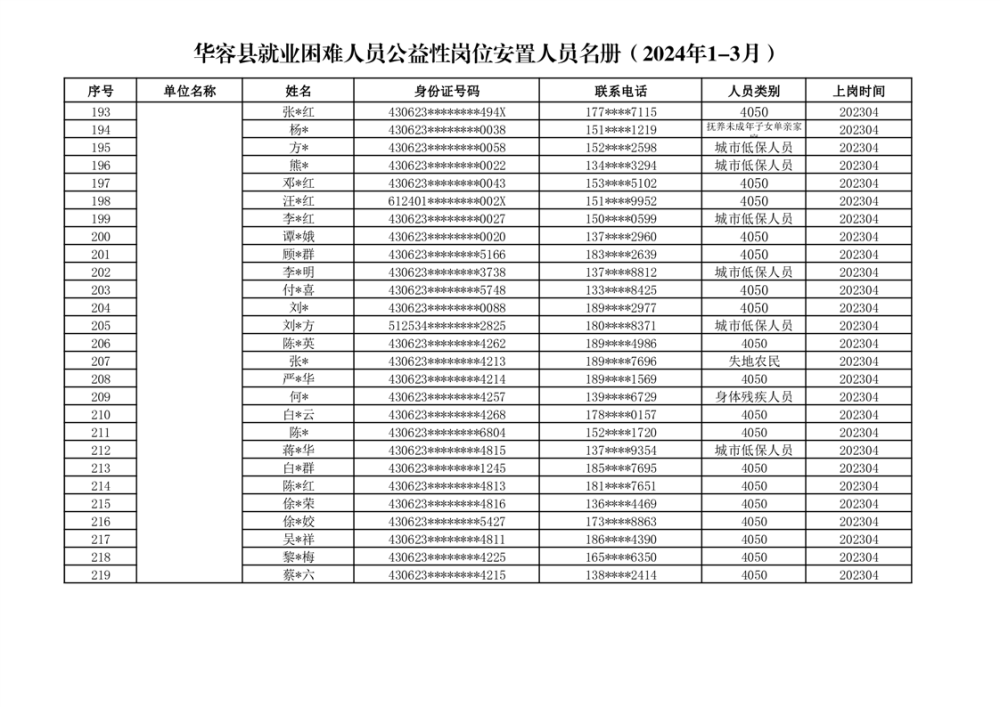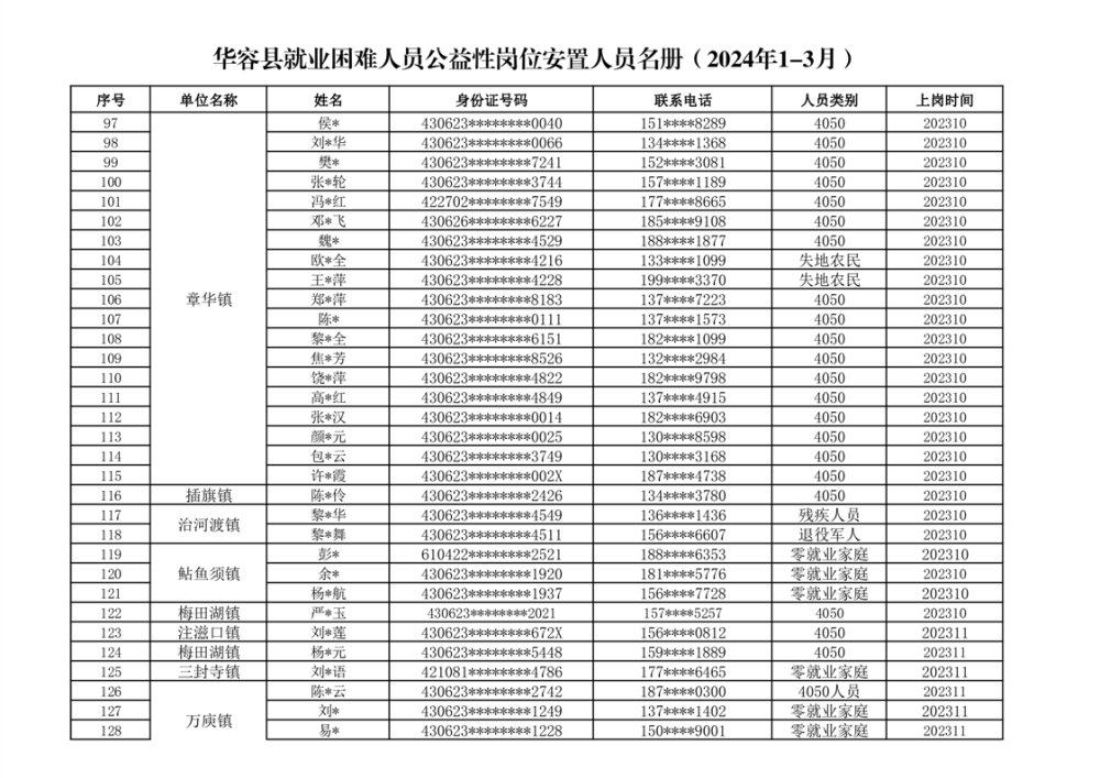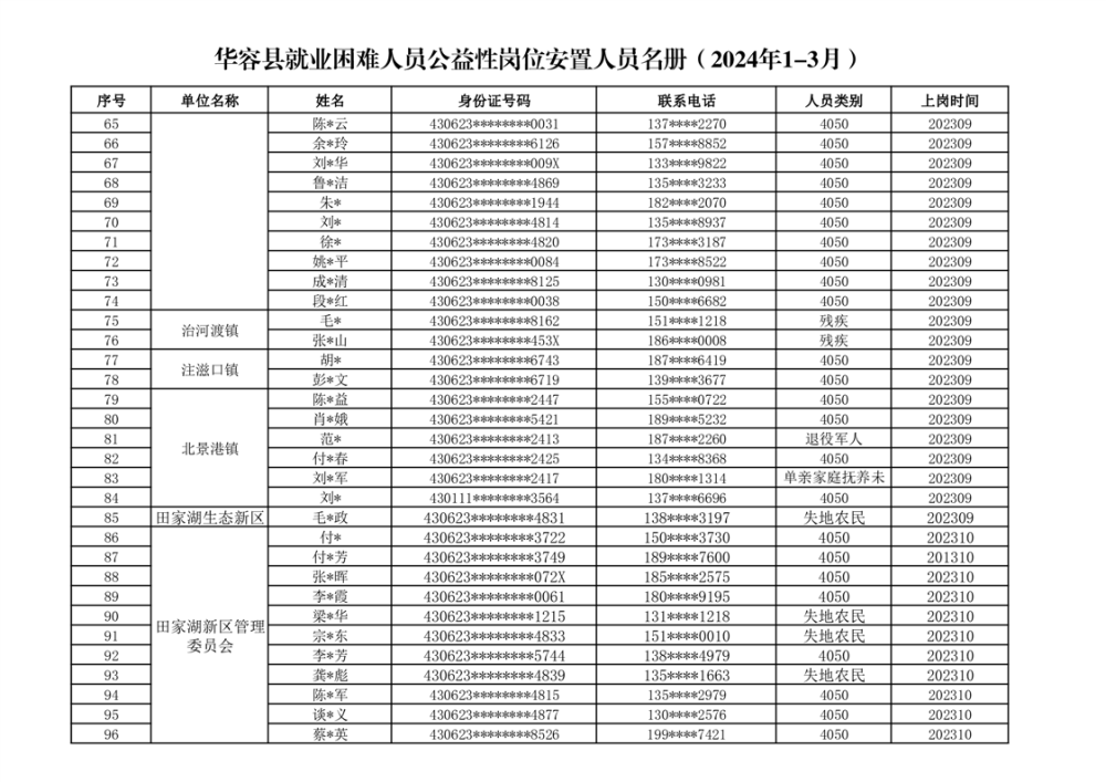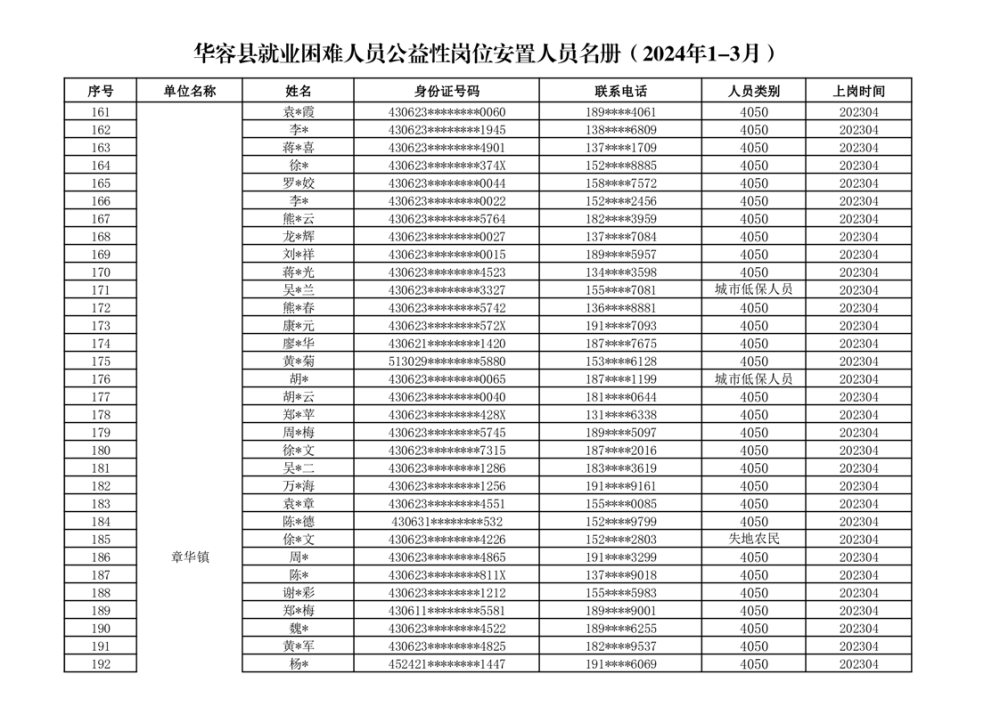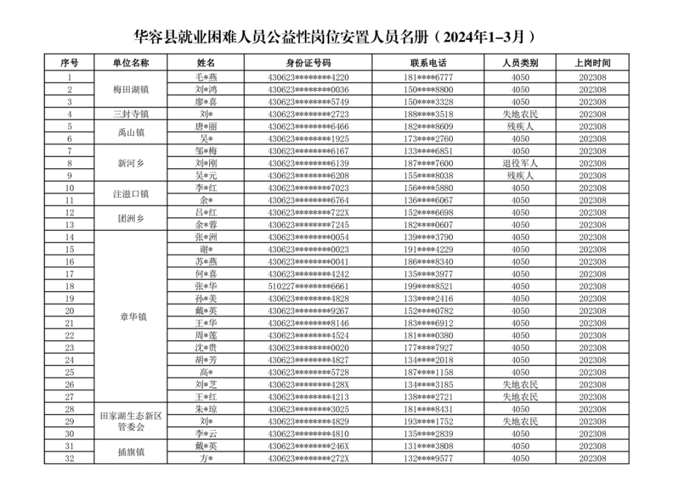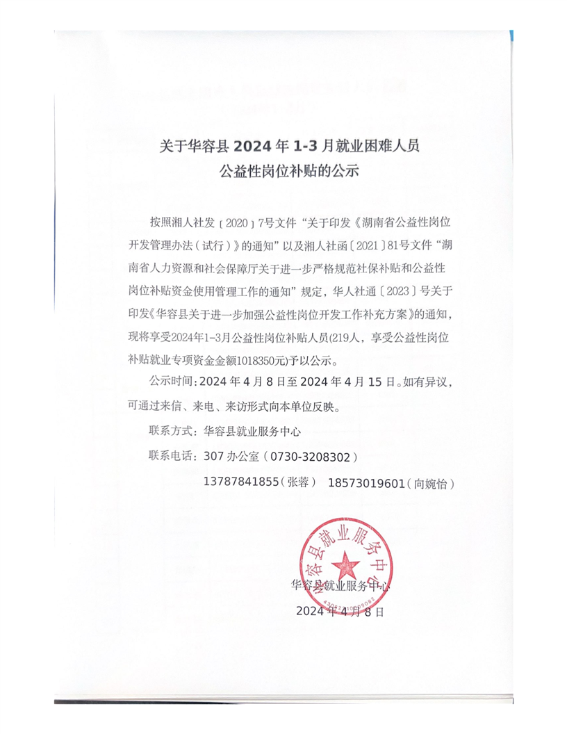 关于华容县2024年1-3月就业困难人员公益性岗位补贴的公示