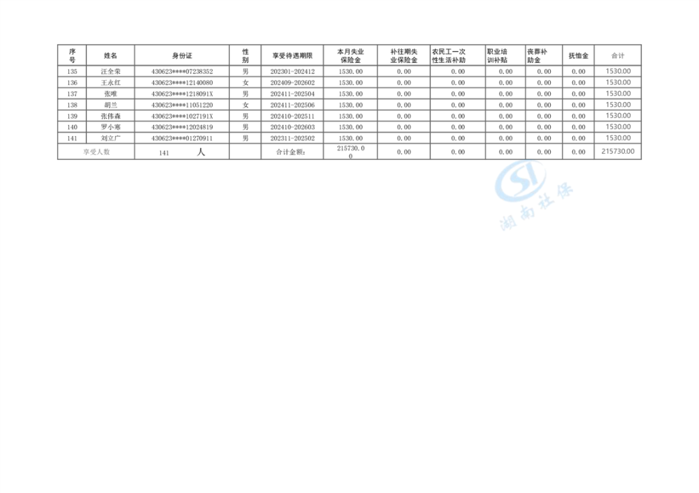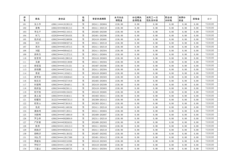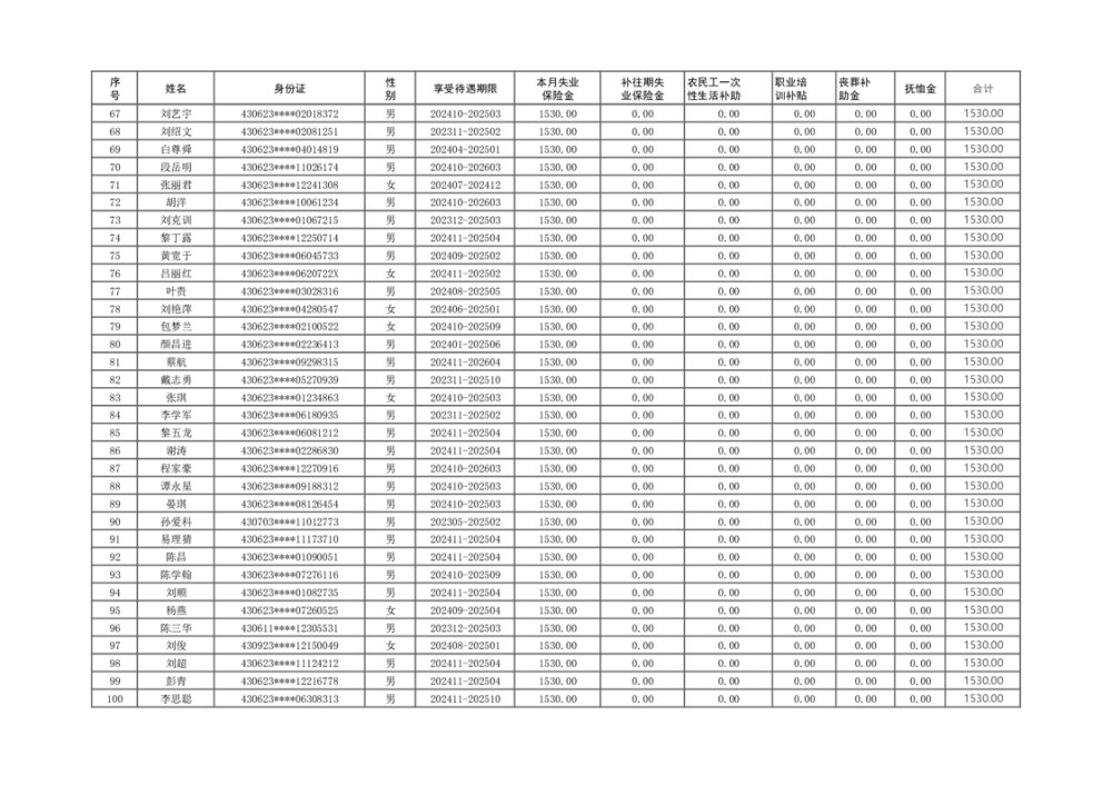 2024年11月失业保险待遇支出核定明细表