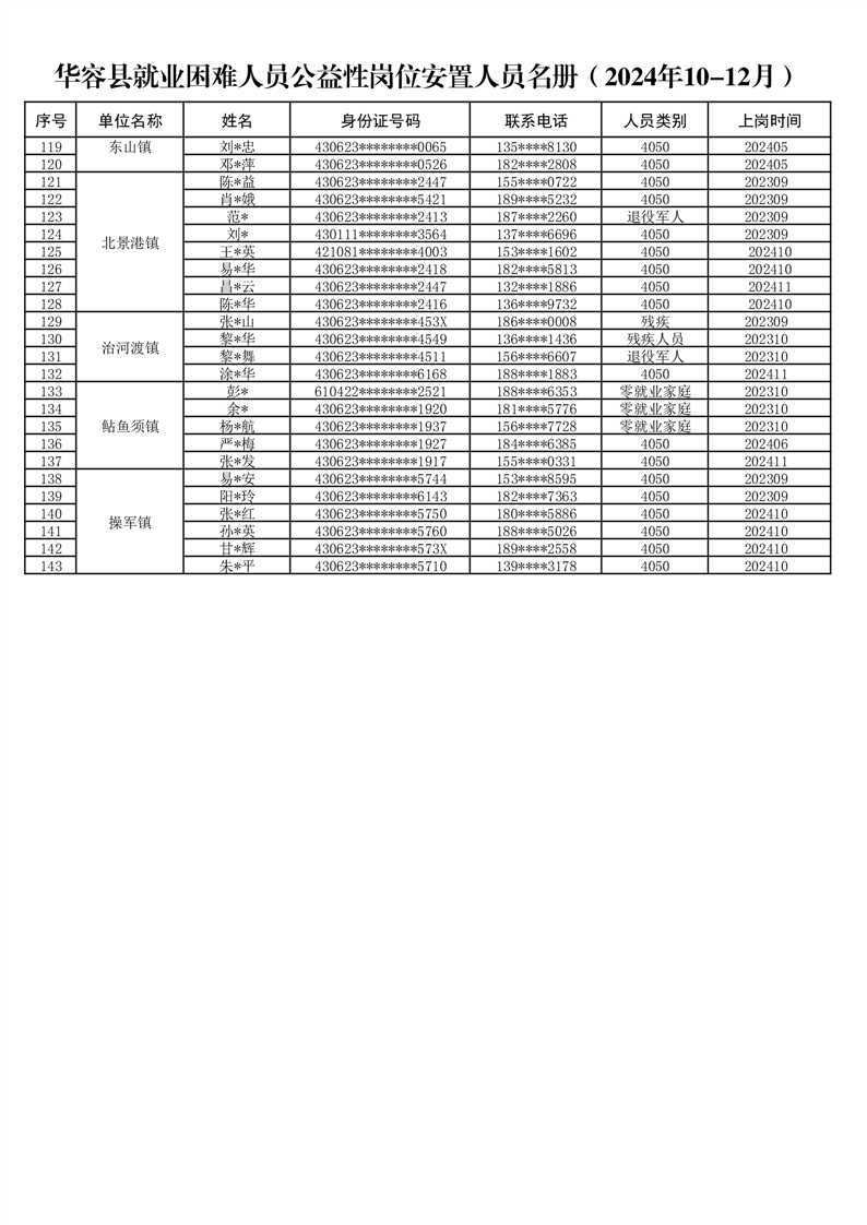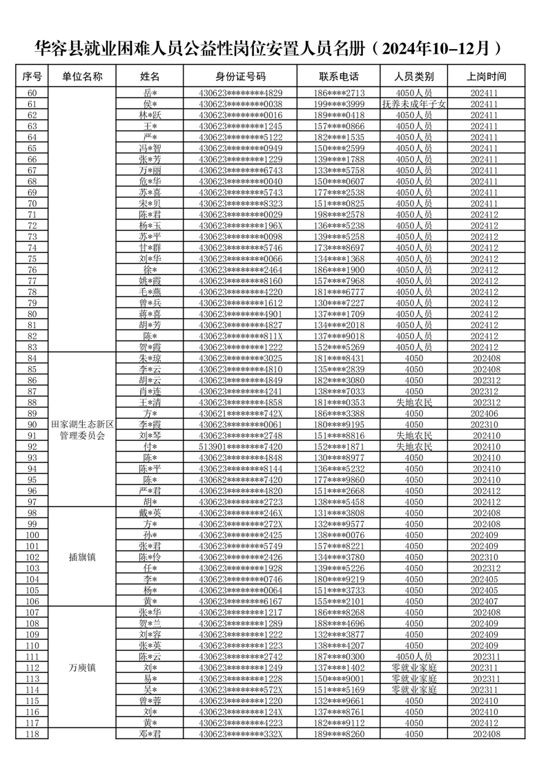 关于华容县2024年10-12月就业困难人员公益性岗位补贴的公示