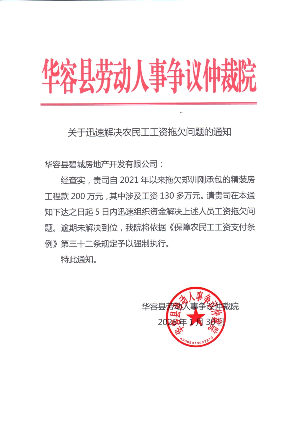 关于迅速解决农民工工资拖欠问题的通知(华容县碧城房地产开发有限公司)