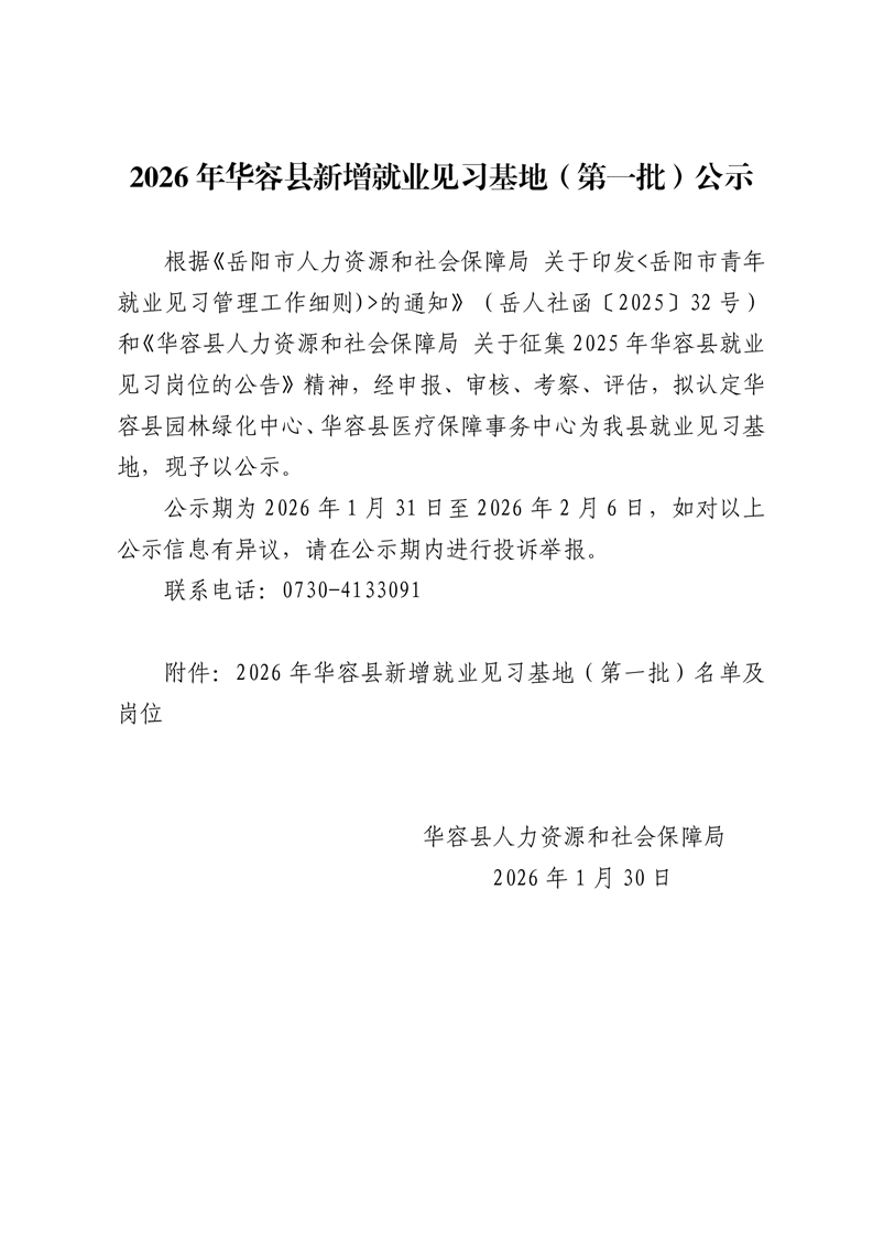 2026年华容县新增就业见习基地(第一批)公示