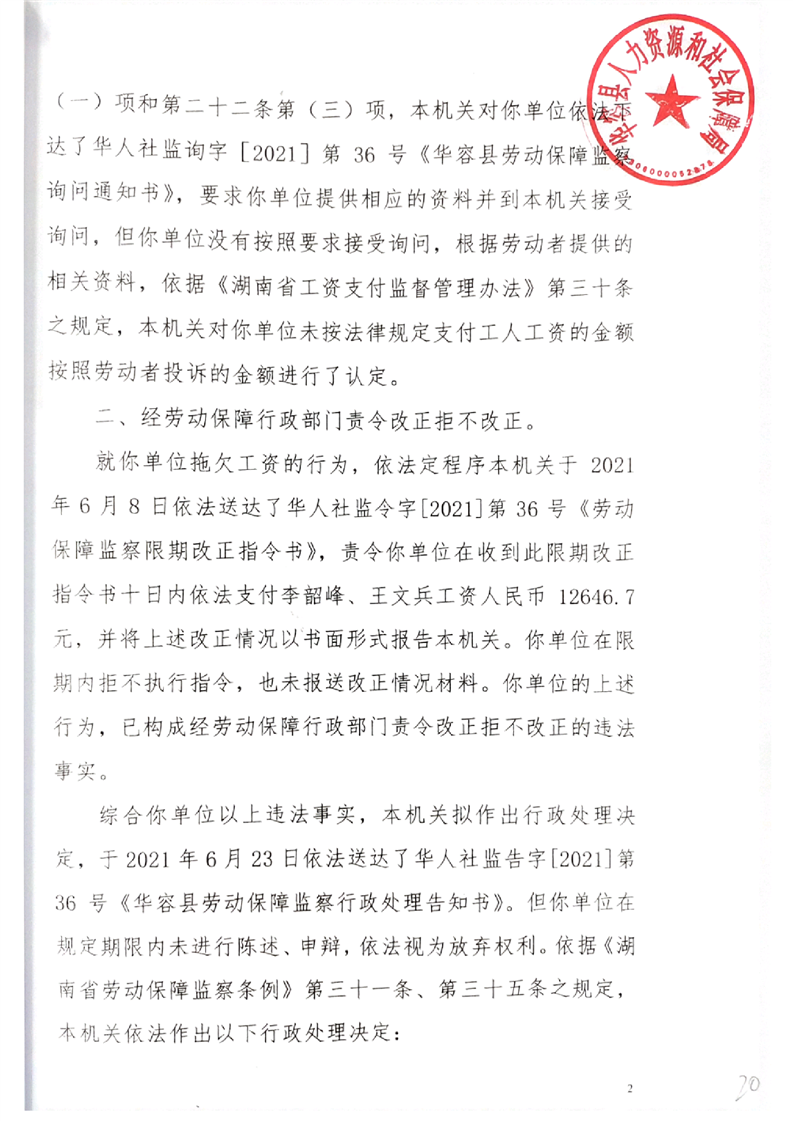华容县劳动保障监察行政处理决定书(华人社监理字〔2021〕第36号)