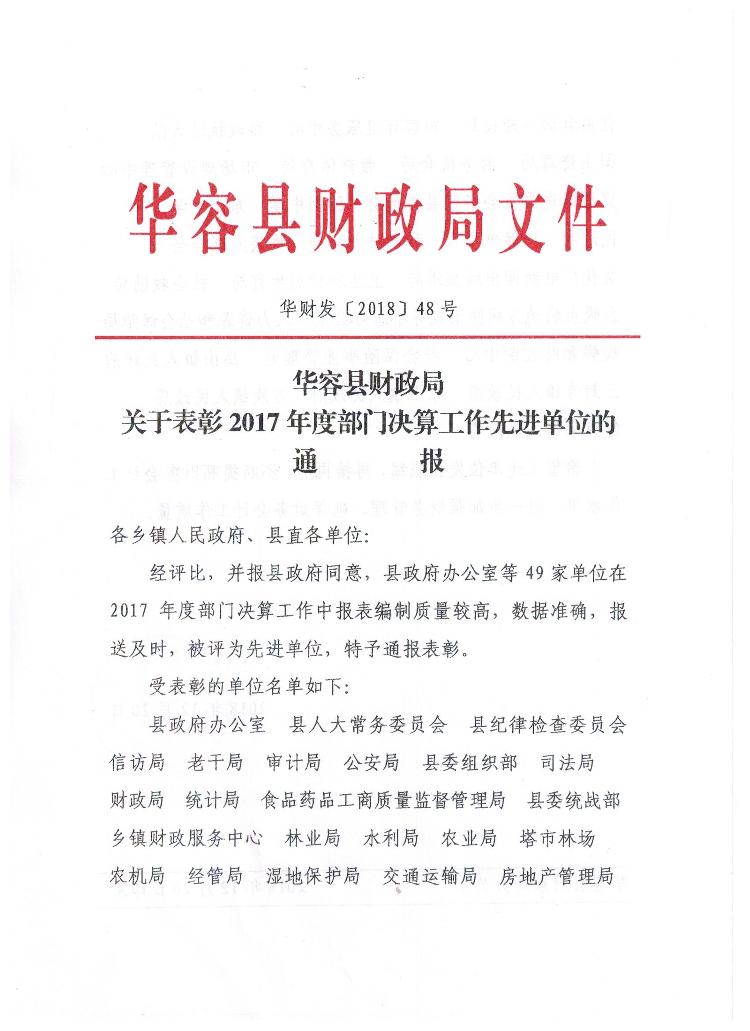 华容县财政局关于表彰2017年度部门决算工作先进单位的通报