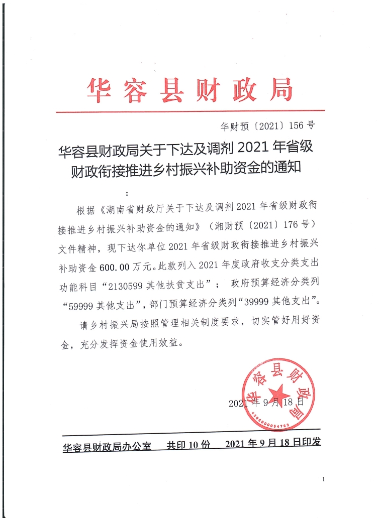 华容县财政局关于下达及调剂2021年省级财政衔接推进乡村振兴补助资金的通知