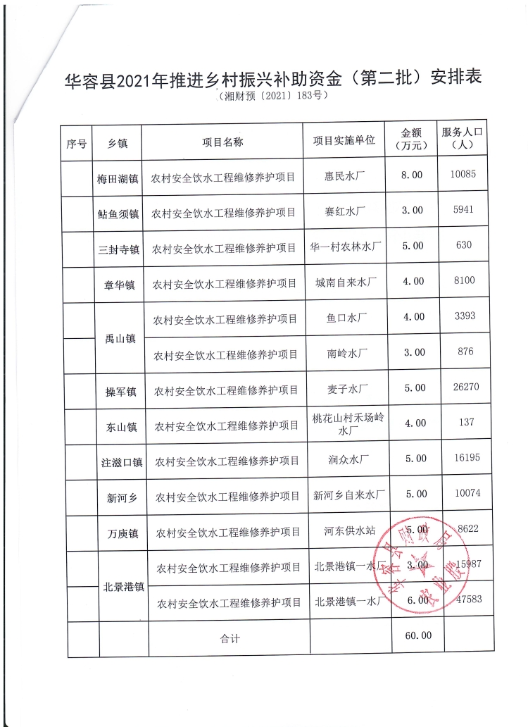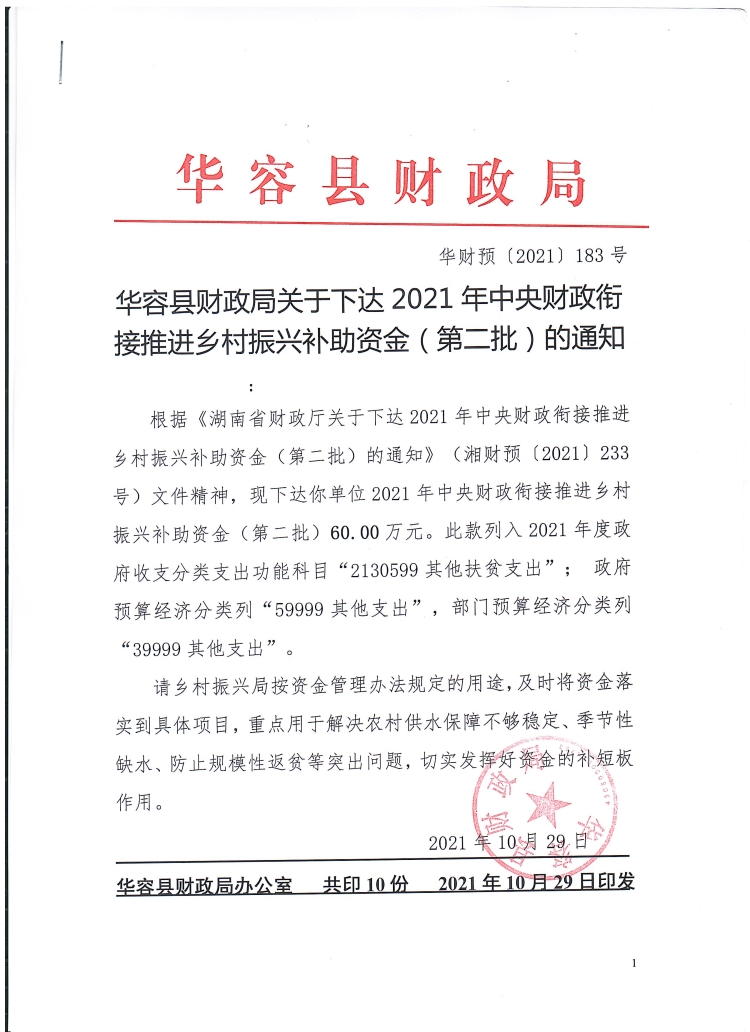 华容县财政局关于下达2021年中央财政衔接推进乡村振兴补助资金(第二批)的通知