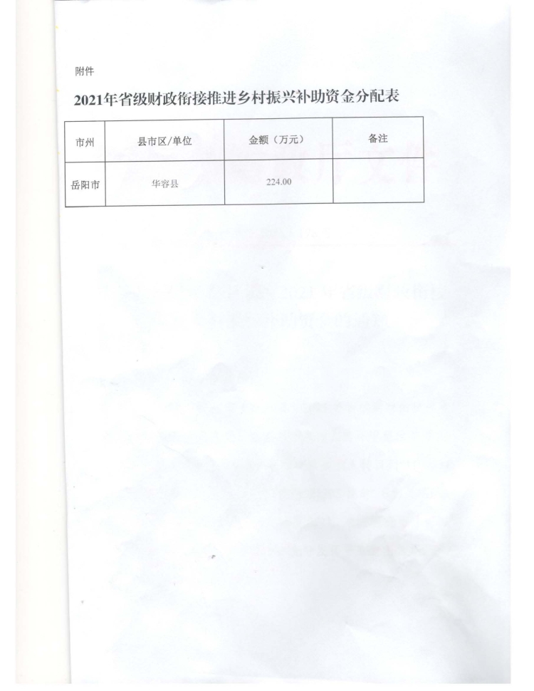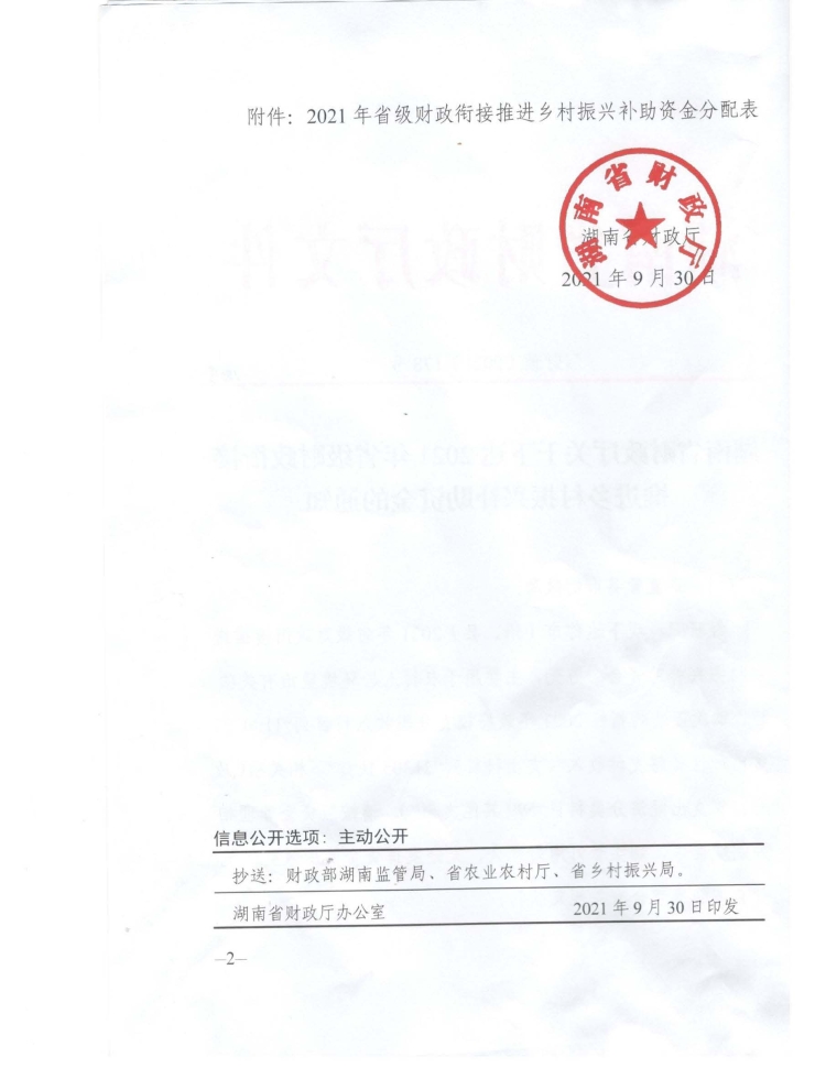 湖南省财政厅关于下达2021年省级财政衔接推进乡村振兴补助资金的通知