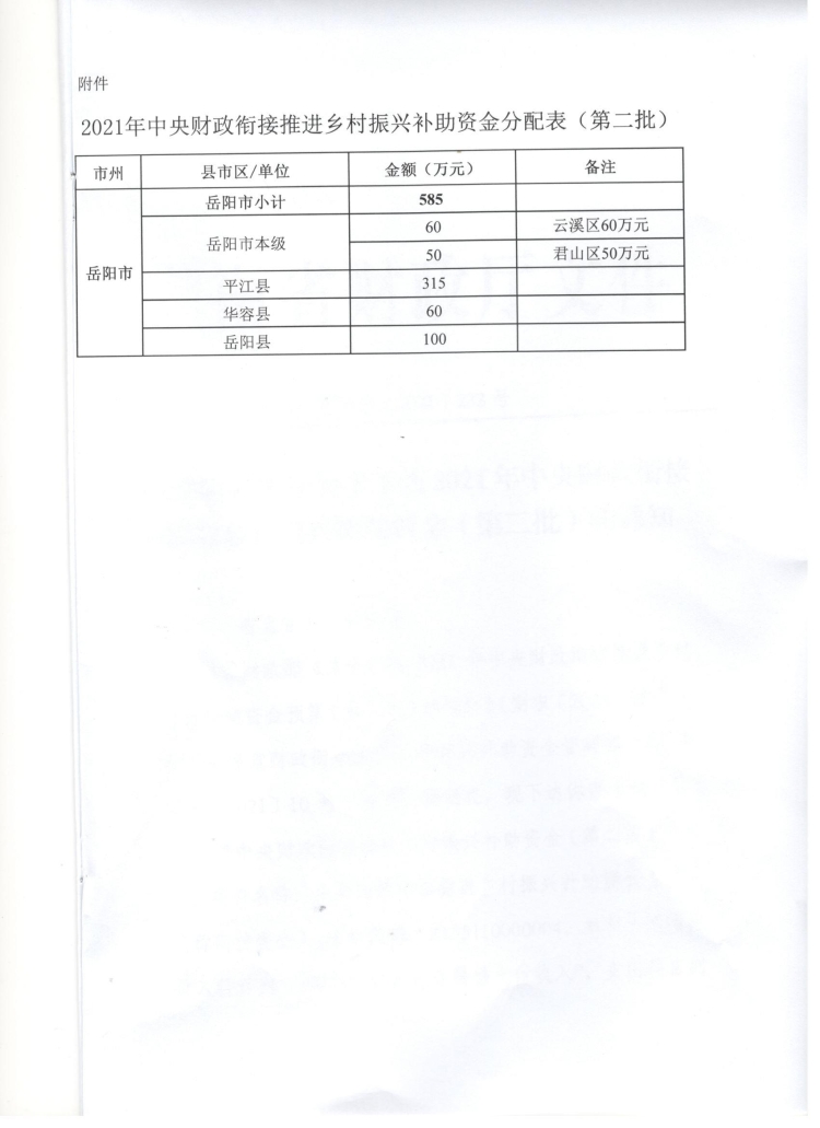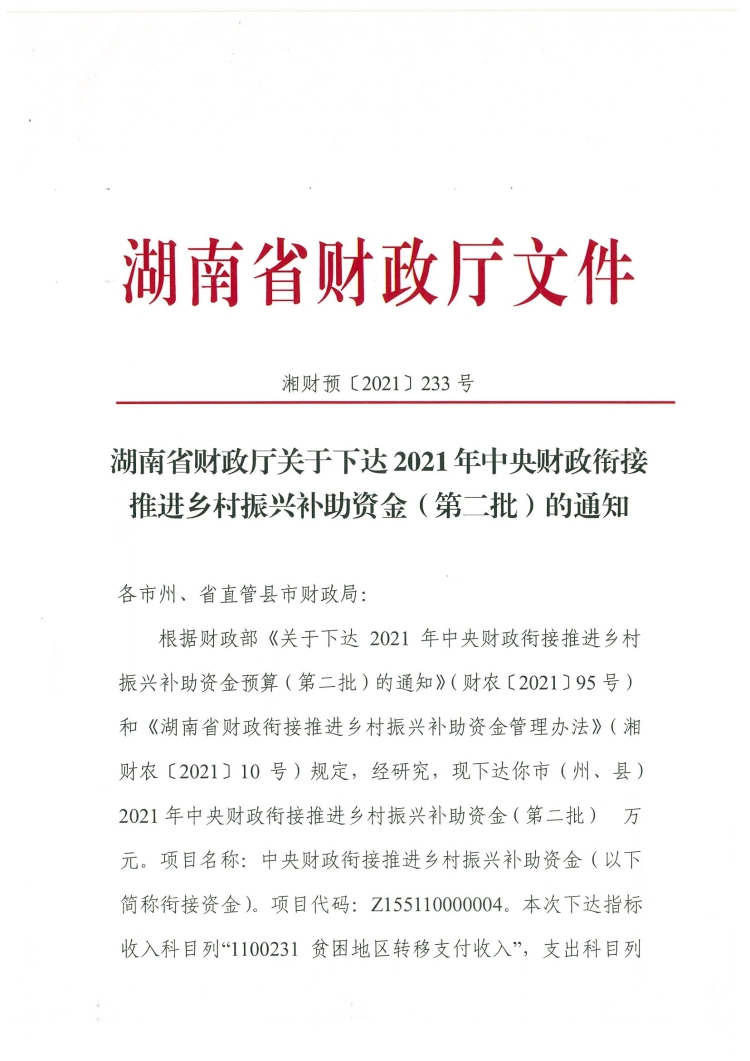 湖南省财政厅关于下达2021年中央财政衔接推进乡村振兴补助资金(第二批)的通知