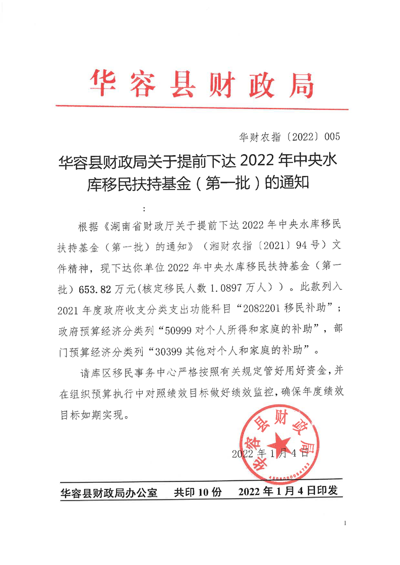 华容县财政局关于提前下达2022年中央水库移民扶持基金(第一批)的通知